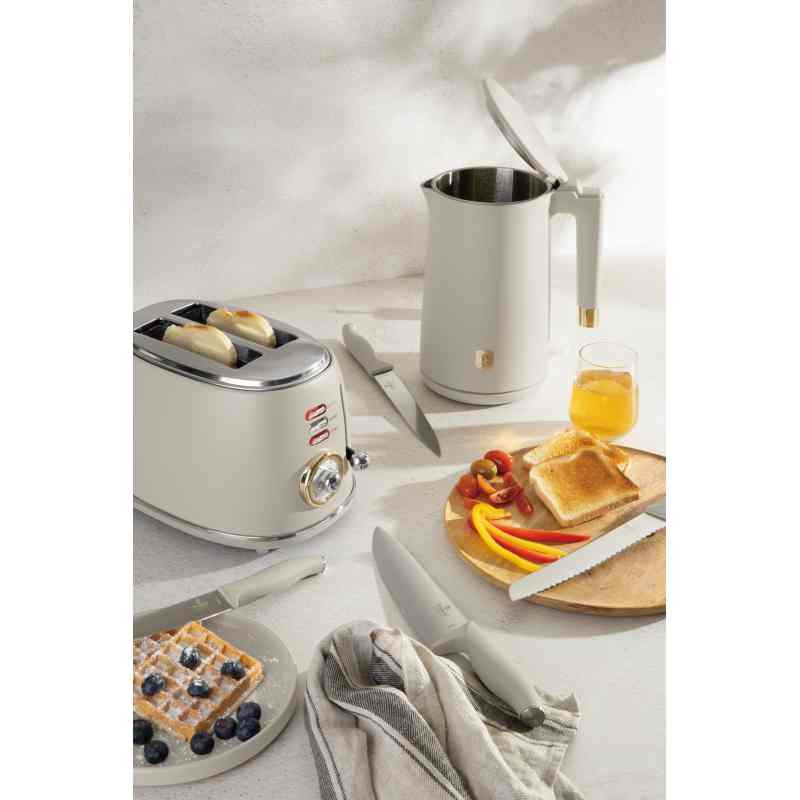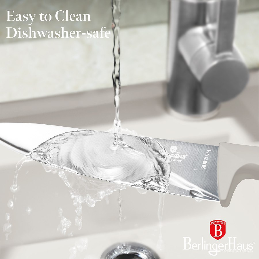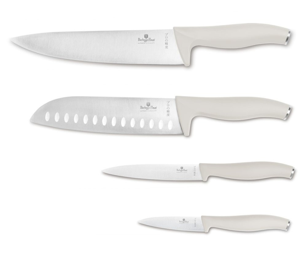 - Vysoko kvalitná nerezová oceľ - Tepelné spracovanie čepele - Ergonomická rukoväť Soft Touch - Ochrana prstov - Ručne ostrené - Elegantný design - Farba: krémová sahara - sada 4 ks obsahuje: - kuchársky nôž 20 cm - nôž Santoku 17,5 cm - univerzálny nôž 12,5 cm - kuchynský nôž 9 cm