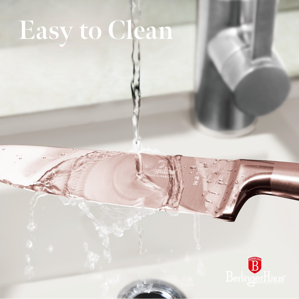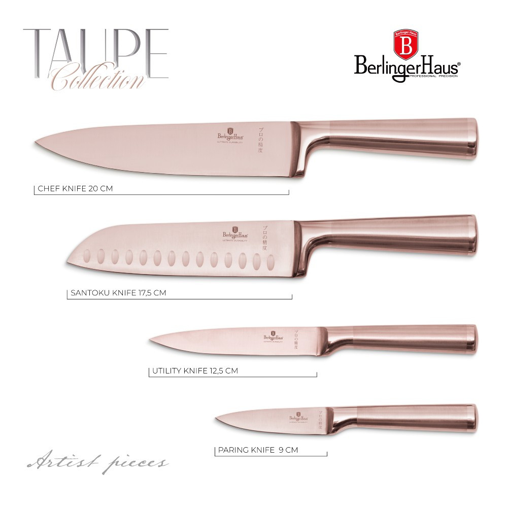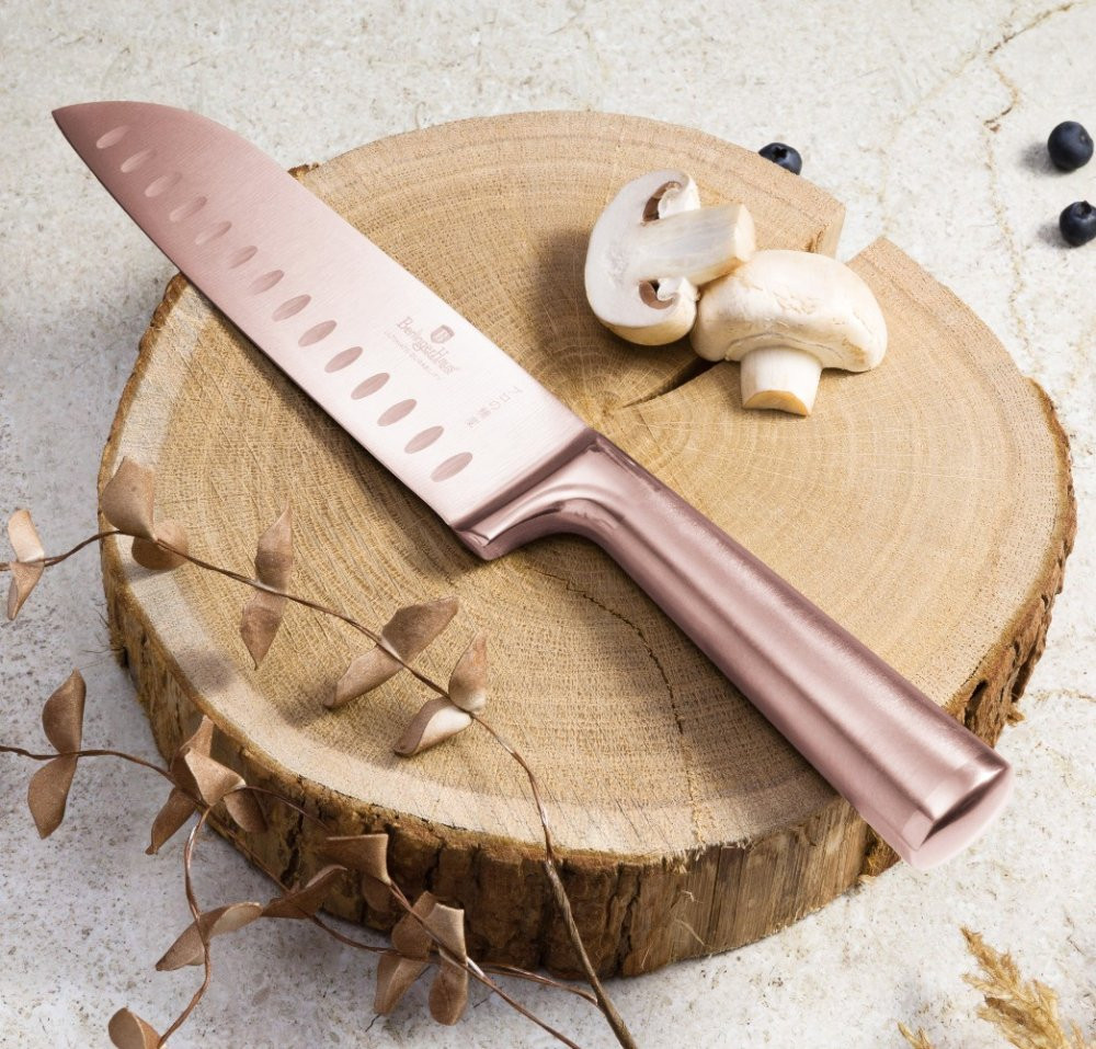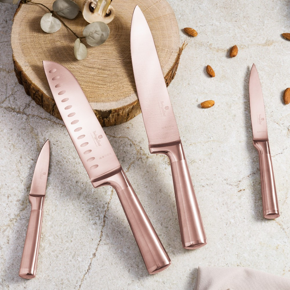 - Materiál: nerezová oceľ 3cr13 s rukoväťou v saténovom a zrkadlovom lesku. - Kuchársky nôž 20 cm - Nôž Santoku 17,5 cm - Úžitkový nôž 12,5 cm - Nôž na okrajovanie 9 cm - Magnetická darčeková krabička - Farba: ružovo-zlatá rose gold - vysoko kvalitná nerezová oceľ - Tepelne spracovaná čepeľ - Ochrana prstov - Ručne brúsený - Elegantný design
