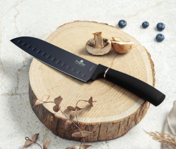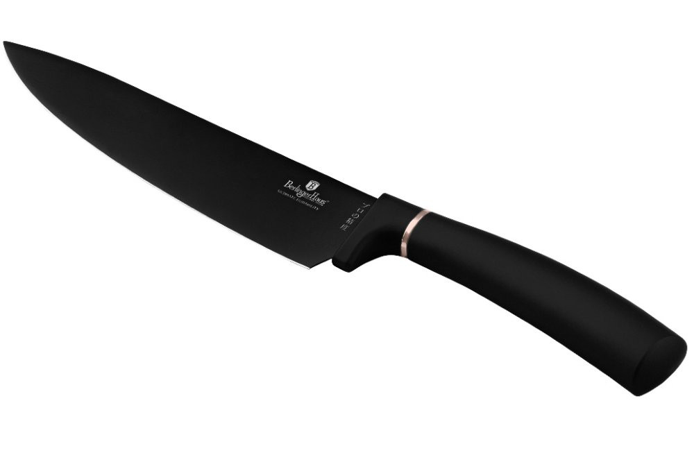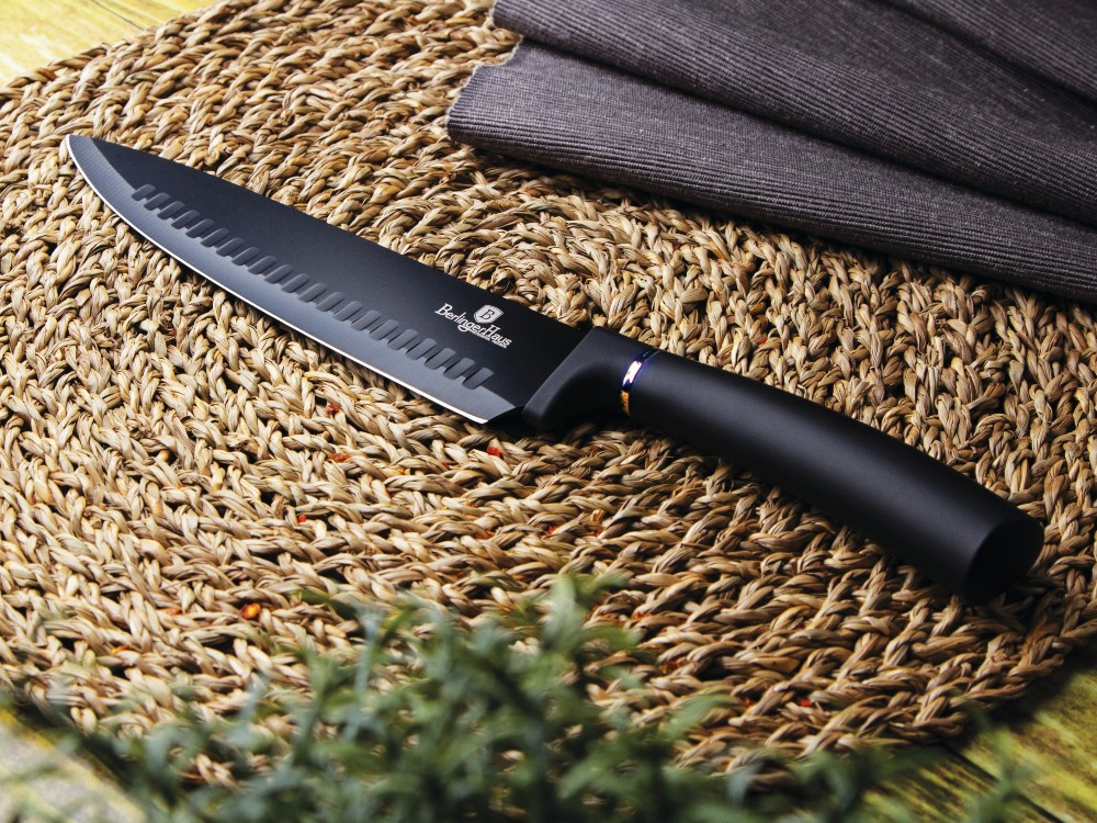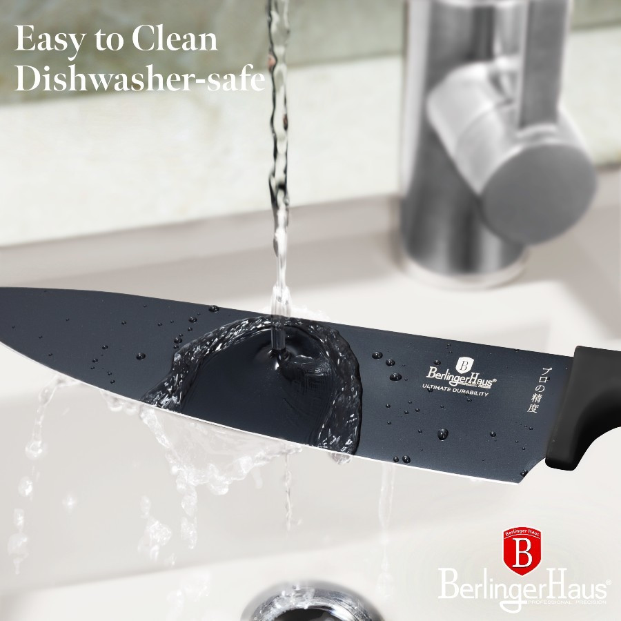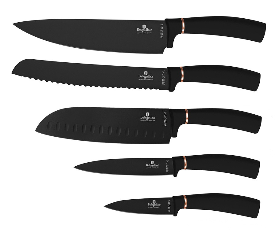 - Materiál: nerezová oceľ s čiernou nepriľnavou vrstvou - Kuchársky nôž 20 cm - Nôž na chlieb 20 cm - Nôž Santoku 17,5 cm - Úžitkový nôž 12,5 cm - Nôž na okrajovanie 9 cm - Magnetický držiak na stenu z agátového dreva - Farba: čierno-ružovo zlatá - ČEPELA VYROBENÁ NOVOU VÝROBNOU TECHNOLÓGIOU - Antibakteriálne - Nezanecháva škvrny - Nezadržuje pachy potravín - Ergonomická rukoväť s mäkkým povrchom - nešmýka sa! - Elegantný design - Šetrný k životnému prostrediu Bez PFOA, LEAD, kadmia