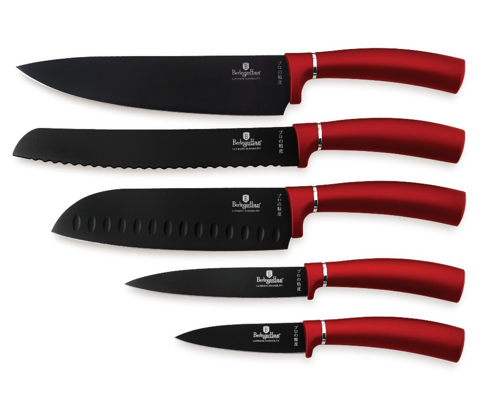 - Materiál: nerezová oceľ s čiernou nepriľnavou vrstvou - Kuchársky nôž 20 cm - Nôž na chlieb 20 cm - Nôž Santoku 17,5 cm - Úžitkový nôž 12,5 cm - Nôž na okrajovanie 9 cm - Magnetický držiak na stenu z agátového dreva - Farba: burgundy - ČEPELA VYROBENÁ NOVOU VÝROBNOU TECHNOLÓGIOU - Antibakteriálne - Nezanecháva škvrny - Nezadržuje pachy potravín - Ergonomická rukoväť s mäkkým povrchom - nešmýka sa! - Elegantný design - Šetrný k životnému prostrediu Bez PFOA, LEAD, kadmia
