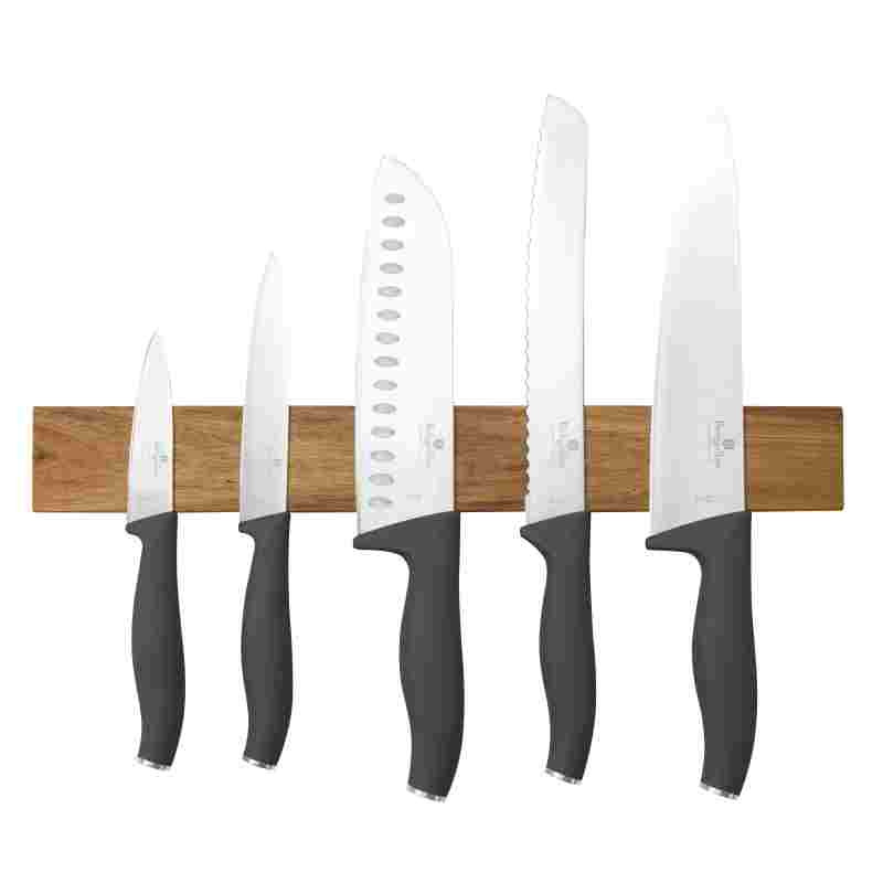 Súprava 6 ks nožov s magnetickým závesom z akáciového dreva, Antracit Collection • Materiál: nerezová oceľ 3cr13 • Kuchársky nôž 20 cm • Nôž na chlieb 20 cm • Nôž Santoku 17,5 cm • Pracovný nôž 12,5 cm • Nôž na krájanie 9 cm • Vešiak z agátového dreva 38x5x2 cm • Farba: antracitová • Vysoko kvalitná nerezová oceľ • Ergonomická mäkká rukoväť • Chránič prstov • Ostrené ručne • Elegantný dizajn