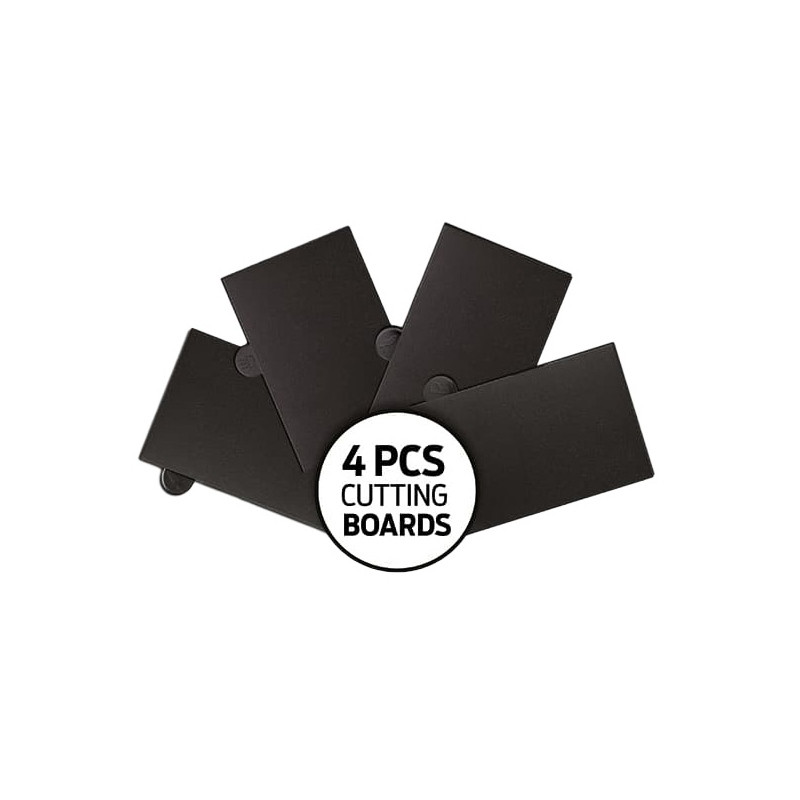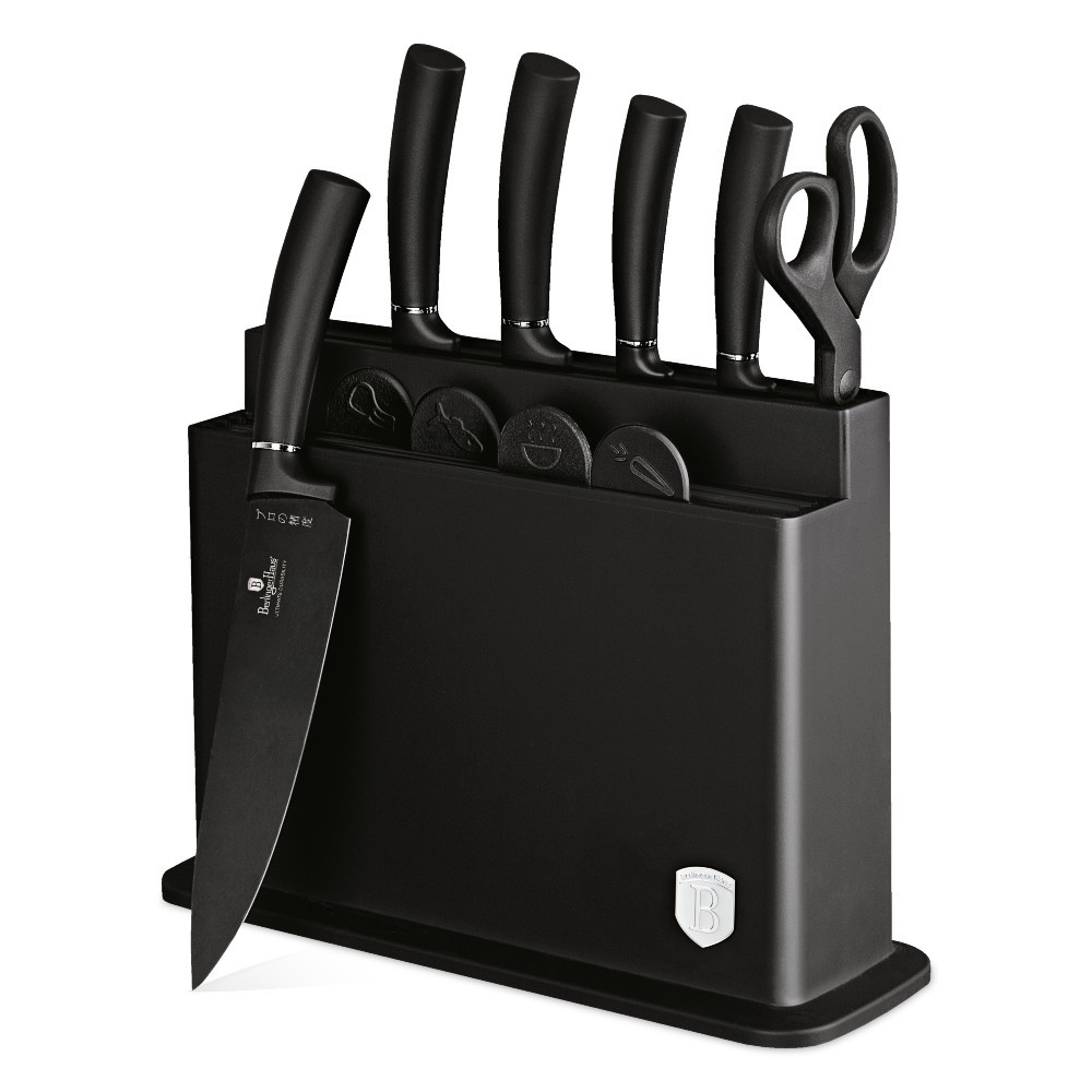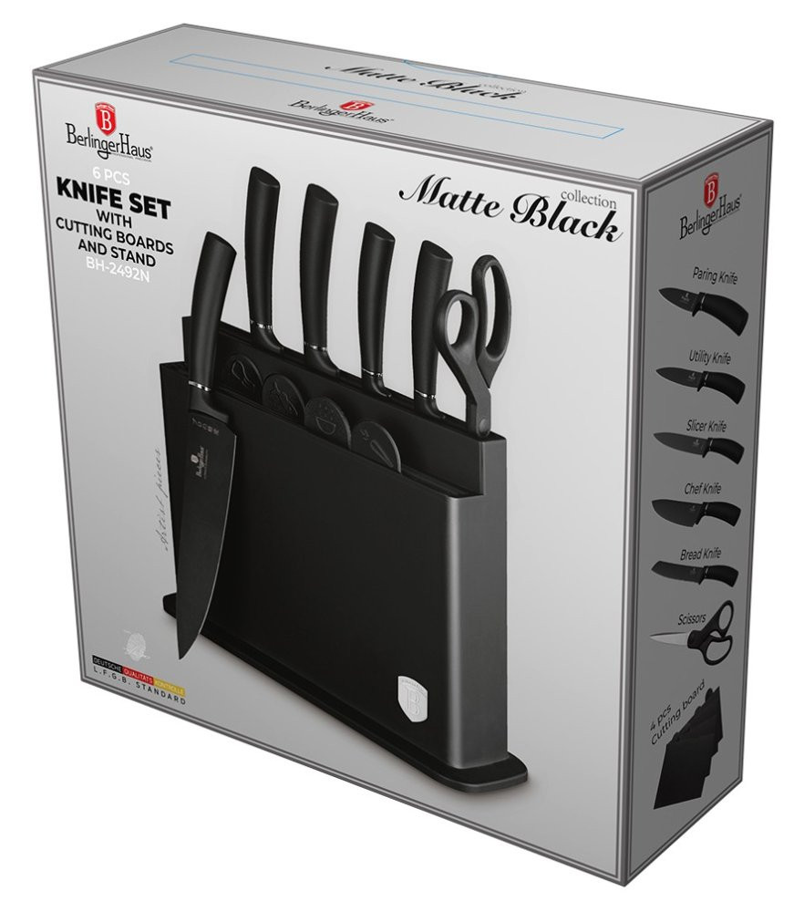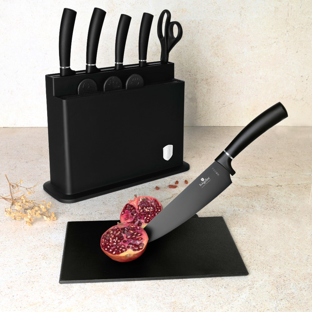 - Materiál: nerezová oceľ s čiernou nepriľnavou vrstvou - Krájacia doska 4 ks - Čierny stojan - Nôž na chlieb 20 cm - Kuchársky nôž 20 cm - Krájací nôž 20 cm - Úžitkový nôž 12,5 cm - Nôž na okrajovanie 9 cm - Nožnice - Farba: čierna REGISTROVANÝ DIZAJN BERLINGER HAUS!!! - ČEPELA VYROBENÁ NOVOU VÝROBNOU TECHNOLÓGIOU - Antibakteriálne - Nezanecháva škvrny - Nezadržuje pachy potravín - Ergonomická rukoväť s mäkkým povrchom - nešmýka sa! - Elegantný design - Šetrný k životnému prostrediu Bez PFOA, LEAD, kadmia"
