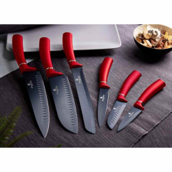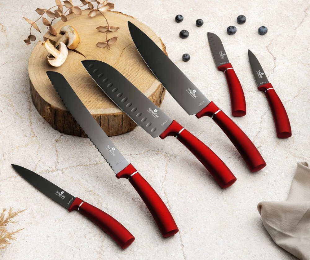 - Materiál: nerezová oceľ s čiernou nepriľnavou vrstvou - Kuchársky nôž 20 cm - Nôž Santoku 17,5 cm - Úžitkový nôž 12,5 cm - Nôž na okrajovanie 9 cm - Farba: burgundy REGISTROVANÝ DIZAJN BERLINGER HAUS!!! - ČEPELA VYROBENÁ NOVOU VÝROBNOU TECHNOLÓGIOU - Antibakteriálne - Nezanecháva škvrny - Nezadržuje pachy potravín - Ergonomická rukoväť s mäkkým povrchom - nešmýka sa! - Elegantný design - Šetrný k životnému prostrediu Bez PFOA, LEAD, kadmia