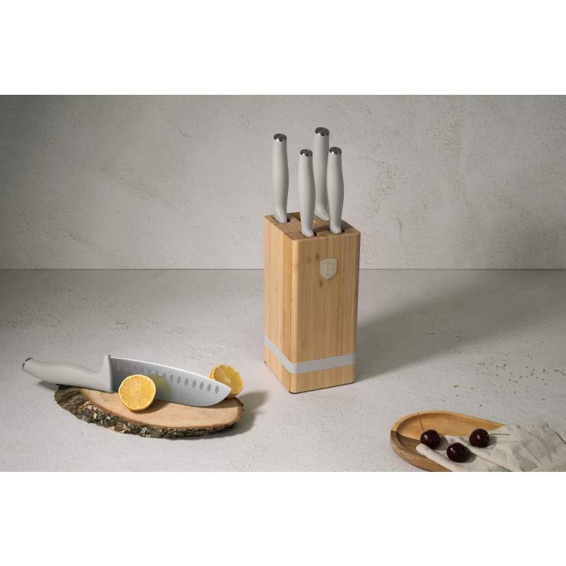 6dielna sada nožov so stojanom BAMBOO • Materiál: nerezová oceľ 3cr13 • Kuchársky nôž 20 cm • Nôž na chlieb 20 cm • Nôž Santoku 17,5 cm • Pracovný nôž 12,5 cm • Nôž na krájanie 9 cm • Bambusový stojan • Farba: béžová • Vysoko kvalitná nerezová oceľ • Čepeľ pre tepelné spracovanie • Ergonomická mäkká rukoväť • Chránič prstov • Ostrené ručne • Bambusový stojan • Elegantný dizajn