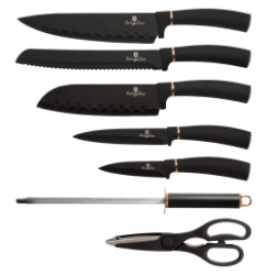 - materiál: nerezová oceľ s nepriľnavým povrchom - nepriľnavý antibakteriálny povrch neničí vitamíny v krájaných potravinách - mäkčená, protišmyková rukoväť s pevným úchopom - sada 8 ks obsahuje: - santoku nôž 17,5 cm - kuchársky nôž 20 cm - nôž na pečivo 20 cm - univerzálny krájací nôž 12,5 cm - lúpací nôž 9 cm - ocieľka - nožnice - 360 ° otočný stojan Kvalitná sada nožov do kuchyne Rýchlo a bezpečne pripravíte všetky druhy surovín, ktoré si zachovajú svoje výživové hodnoty , chuť i arómu . Výsledkom vašej práce budú lahodné a zdravé pokrmy. Súprava nožov v stojane 8 ks Black Rose Collection je výbornou alternatívou pre kuchárov rôznych úrovní, na ktorej výrobu bol použitý kvalitný materiál: nerez oceľ s nepriľnavým povrchom, vynikajú perfektnou ostrosťou čepele a dizajnom . Veľmi oceníte aj ergonomicky tvarovanú rukoväť , vďaka ktorej sa vám nože budú skvele držať. Celá sada je dielom výrobcu BERLINGERHAUS, ktorá sa výrobe nožov venuje pomerne dlho a sú riadne odskúšané. Aké nože sú súčasťou základnej sady Ak pripravujete základné suroviny , budete s touto sadou nadmieru spokojní, pretože obsahuje 8 ks univerzálnych, veľmi kvalitných nožov . Sú vyladené tak, aby ste dokázali pracovať so všetkými štandardnými surovinami v kuchyni. Aké výhody má sada kuchynských nožov Nože môžete postupne kupovať po kusoch alebo si zaobstarať naraz celú sadu nožov a ušetriť čas, peniaze a mať hneď po ruke nože rôznych typov. Súprava nožov ponúka hneď niekoľko výhod: Nože a ďalšie príslušenstvo v sade je od jedného výrobcu (BERLINGERHAUS). Každá sada má svoj jedinečný a zladený dizajn . Ozvláštnite s nimi kuchyňu a stanú sa zaujímavým kuchynským doplnkom . Súprava vám vydrží niekoľko rokov – ľahko sa vám budú udržiavať ostré, vďaka ocieľke alebo brúsku, ktoré sú súčasťou niektorých sád. Ergonomická rukoväť zaistí, že sa vám bude s nožmi skvele a bezpečne pracovať. Budete ich mať rýchlo k dispozícii a rozdielne typy nožov vám pomôžu s krájaním napríklad pečiva, zeleniny a ďalších surovín. Sadu môžete jednoducho doplniť o ďalšie príslušenstvo – nožnice, škrabky na zeleninu a ovocie, praktický stojan (blok) alebo magnetickú lištu, ocieľku alebo brúsik.