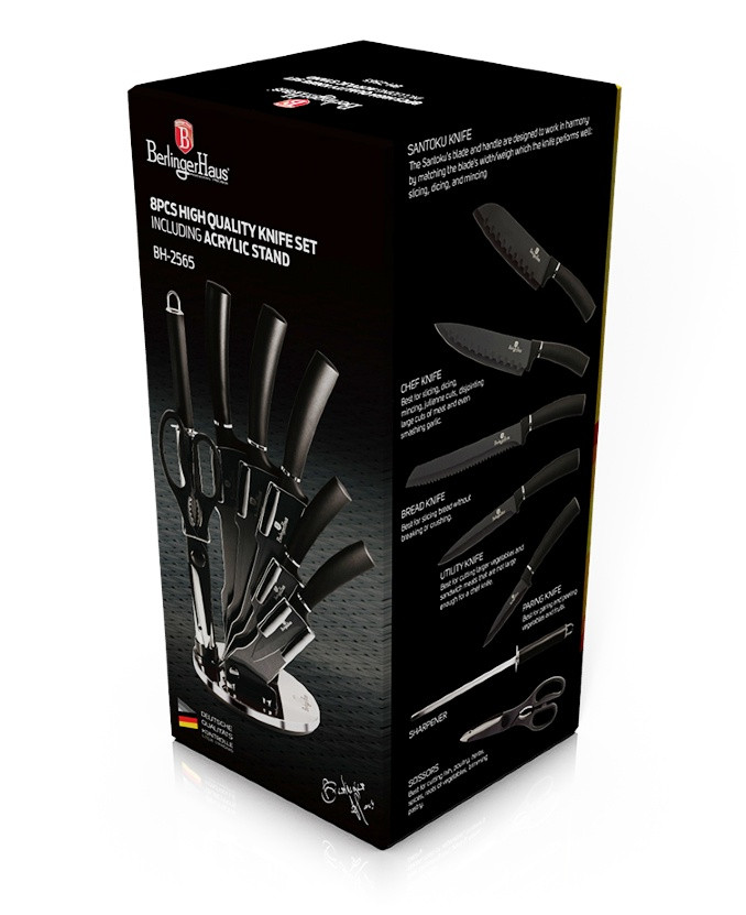 Súprava nožov z kolekcie Black Silver od značky BerlingerHaus je opatrená antibakteriálnym nepriľnavým povrchom Diamond, vďaka ktorému nestráca potraviny svoje vitamíny a minerály. Protišmyková Soft-Touch rukoväť pohodlne padne do ruky a pri krájaní sa nešmýka. Kompletná sada 5tich nožov obsahuje navyše univerzálne nožnice a ocieľku, nože môžete kedykoľvek nabrúsiť a mať ich stále dokonale ostré! Atraktívny stojan v tvare vejára je otočný o 360 °, vďaka tomu máte nože vždy prehľadne po ruke. - materiál: nerezová oceľ - antibakteriálny nepriľnavý povrch Diamond - mäkčená rukoväť - veľmi jednoduché čistenie - sada 8 ks obsahuje: (dĺžky čepelí) - nôž Santoku 17,5 cm - kuchársky nôž 20 cm - nôž na pečivo 20 cm - univerzálny nôž 12,5 cm - lúpací nôž 9 cm - ocieľka - nožnice - otočný stojan - farba: čierna - kolekcia Black Silver Collection Kvalitná sada nožov do kuchyne Rýchlo a bezpečne pripravíte všetky druhy surovín, ktoré si zachovajú svoje výživové hodnoty , chuť i arómu . Výsledkom vašej práce budú lahodné a zdravé pokrmy. Sada nožov v stojane 8 ks Black Silver Collection je výbornou alternatívou pre kuchárov rôznych úrovní, na ktorej výrobu bol použitý kvalitný materiál: nerez oceľ s nepriľnavým povrchom, vynikajú perfektnou ostrosťou čepele a dizajnom . Veľmi oceníte aj ergonomicky tvarovanú rukoväť , vďaka ktorej sa vám nože budú skvele držať. Celá sada je dielom výrobcu BERLINGERHAUS, ktorá sa výrobe nožov venuje pomerne dlho a sú riadne odskúšané. Aké nože sú súčasťou základnej sady Ak pripravujete základné suroviny , budete s touto sadou nadmieru spokojní, pretože obsahuje 8 ks univerzálnych, veľmi kvalitných nožov . Sú vyladené tak, aby ste dokázali pracovať so všetkými štandardnými surovinami v kuchyni. Aké výhody má sada kuchynských nožov Nože môžete postupne kupovať po kusoch alebo si zaobstarať naraz celú sadu nožov a ušetriť čas, peniaze a mať hneď po ruke nože rôznych typov. Súprava nožov ponúka hneď niekoľko výhod: Nože a ďalšie príslušenstvo v sade je od jedného výrobcu (BERLINGERHAUS). Každá sada má svoj jedinečný a zladený dizajn . Ozvláštnite s nimi kuchyňu a stanú sa zaujímavým kuchynským doplnkom . Súprava vám vydrží niekoľko rokov – ľahko sa vám budú udržiavať ostré, vďaka ocieľke alebo brúsku, ktoré sú súčasťou niektorých sád. Ergonomická rukoväť zaistí, že sa vám bude s nožmi skvele a bezpečne pracovať. Budete ich mať rýchlo k dispozícii a rozdielne typy nožov vám pomôžu s krájaním napríklad pečiva, zeleniny a ďalších surovín. Sadu môžete jednoducho doplniť o ďalšie príslušenstvo – nožnice, škrabky na zeleninu a ovocie, praktický stojan (blok) alebo magnetickú lištu, ocieľku alebo brúsik.