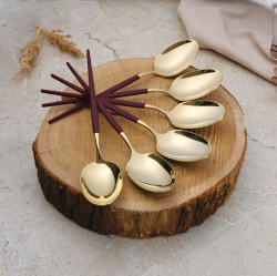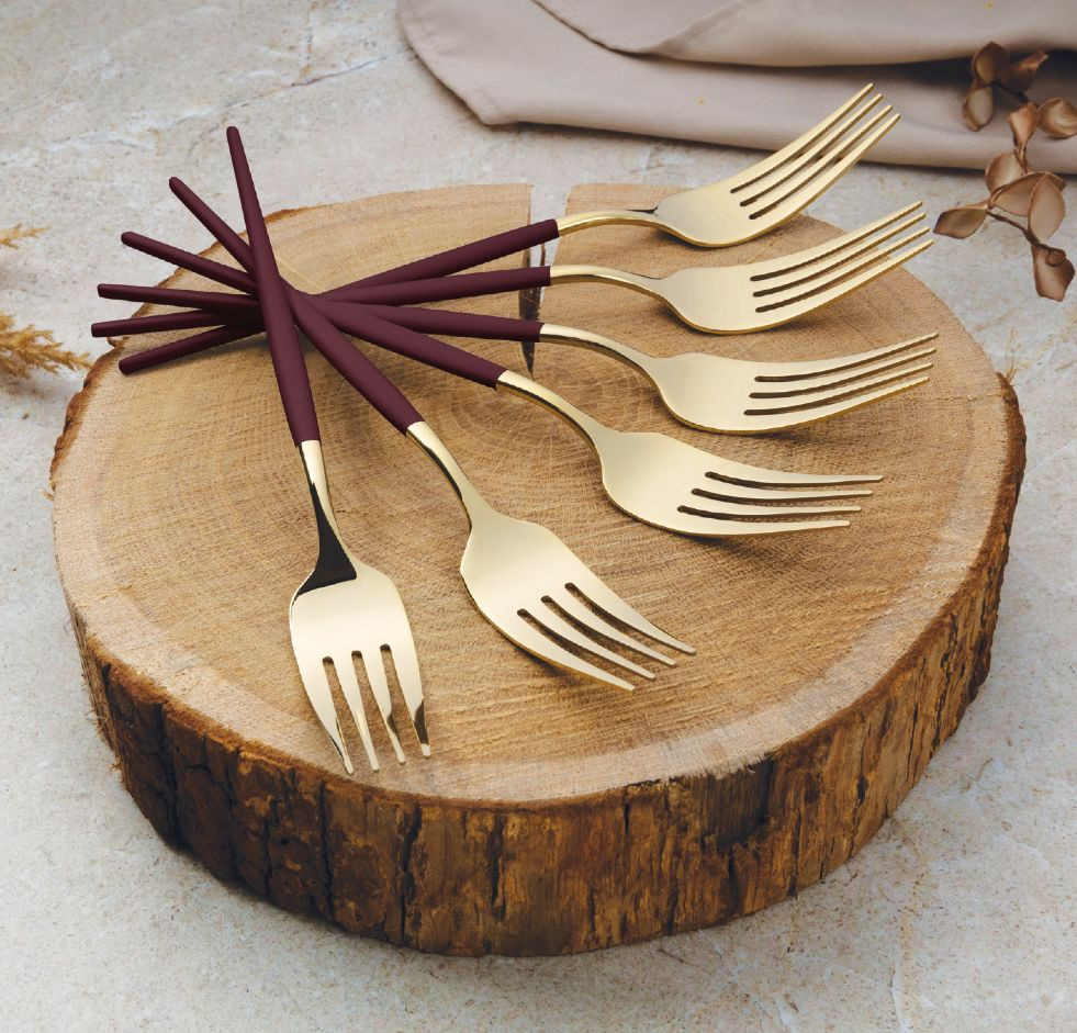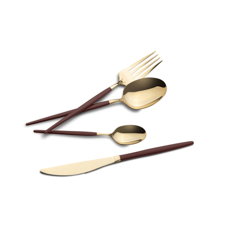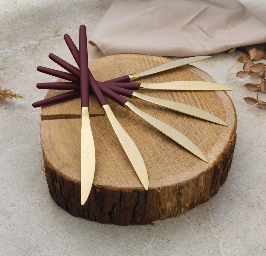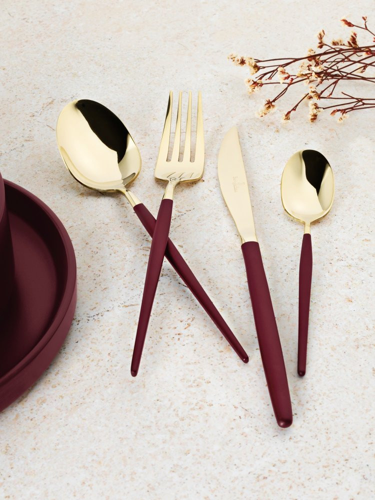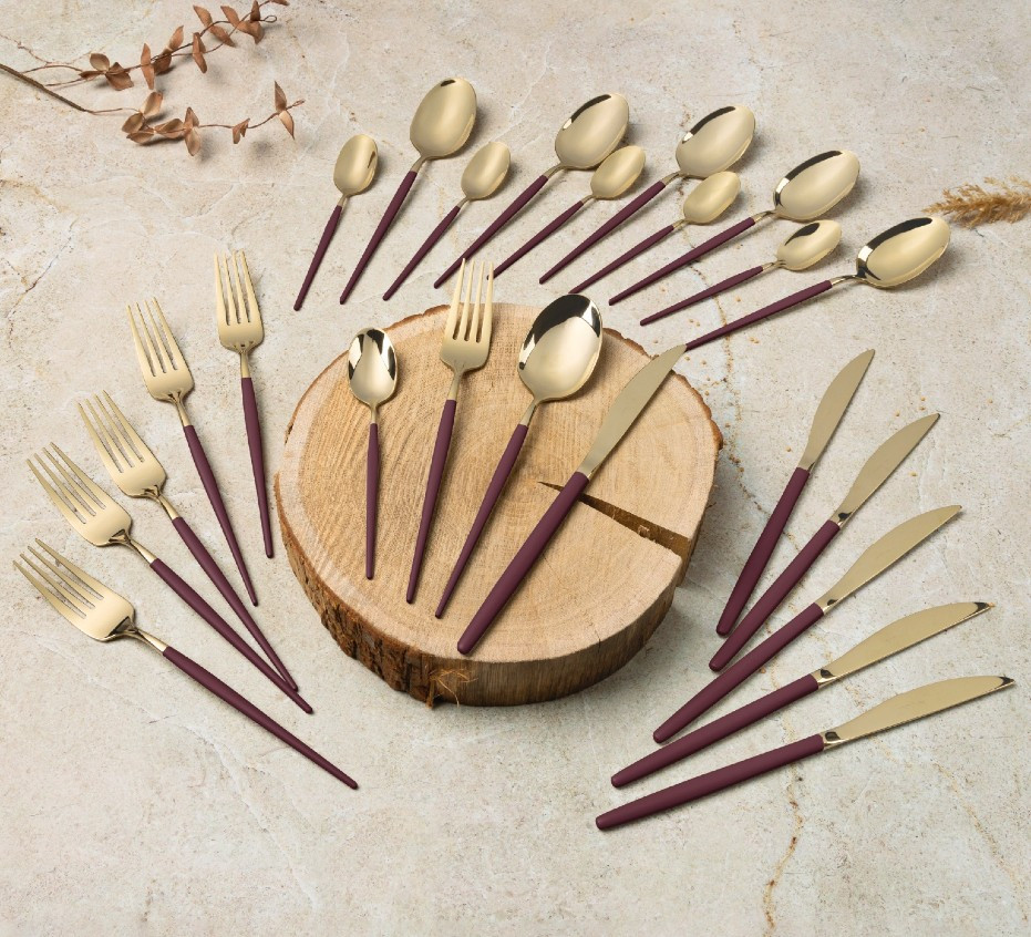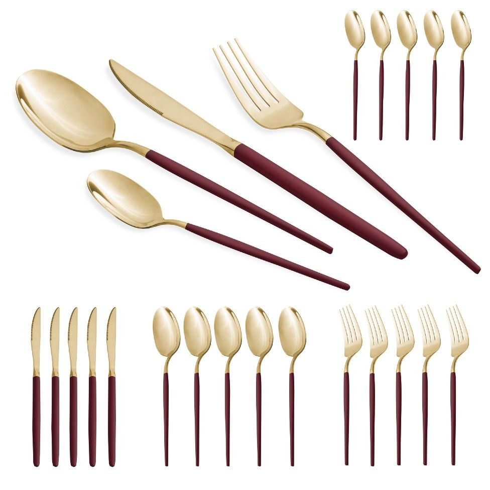 - Materiál: Nerezová oceľ s leštenou povrchovou úpravou - Sada obsahuje: - Nôž 6 ks 7,0 mm - Vidlička 6 ks 4,0 mm - Lyžica 6 ks 4,0 mm - Čajová lyžička 6 ks 2,7 mm - Farba: zlatá champagne / červená burgundy - elegantný dizajn - Vysoko kvalitná nerezová oceľ so zlatým PVD povlakom - Reprezentatívna darčeková krabička - Zrkadlový leštený povrch