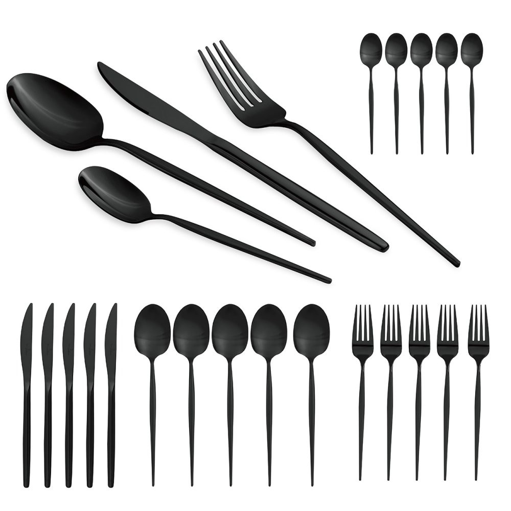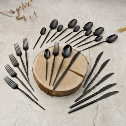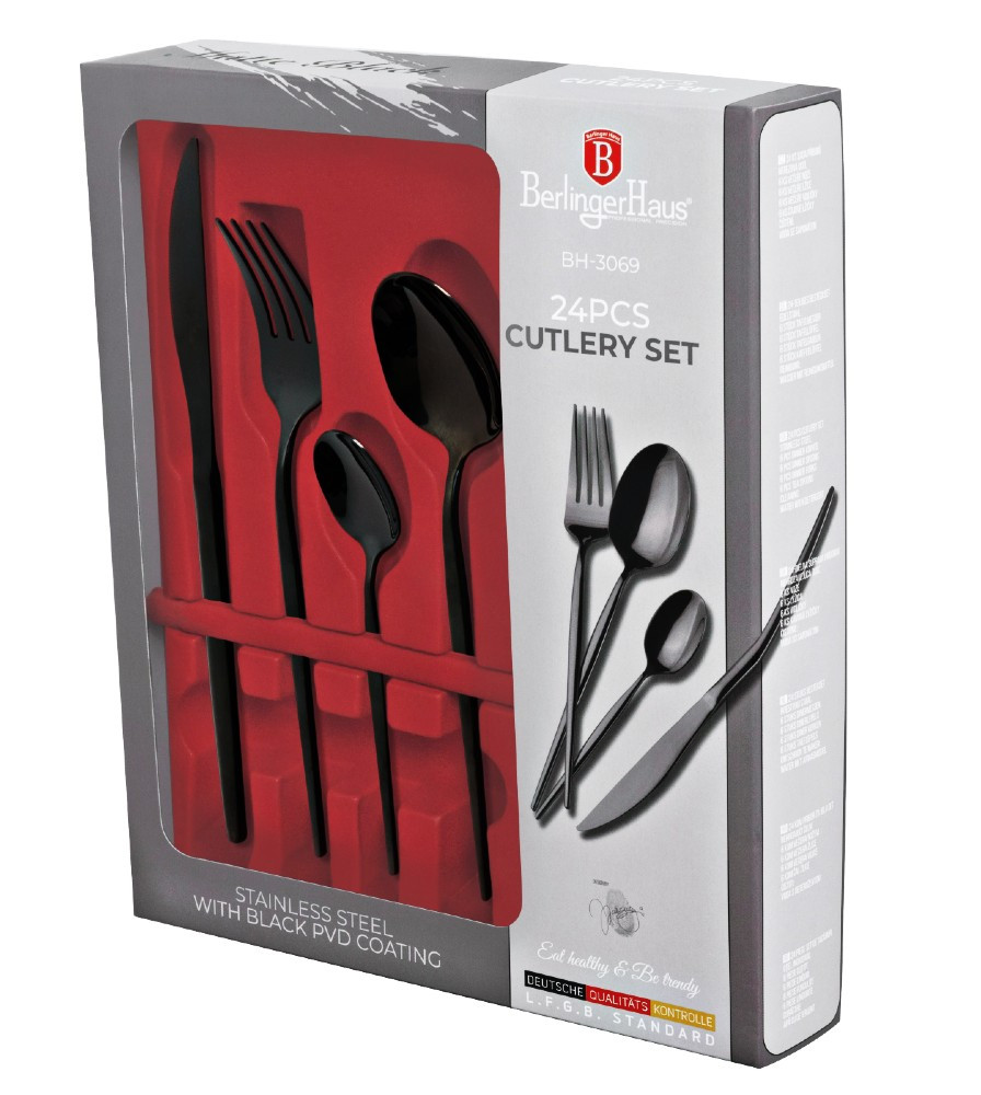 - Materiál: Nerezová oceľ s leštenou povrchovou úpravou - Sada obsahuje: - Nôž 6 ks 7,0 mm - Vidlička 6 ks 4,0 mm - Lyžica 6 ks 4,0 mm - Čajová lyžička 6 ks 2,7 mm - Farba: čierna - elegantný dizajn - Vysoko kvalitná nerezová oceľ s čiernym PVD povlakom - Reprezentatívna darčeková krabička - Zrkadlový leštený povrch