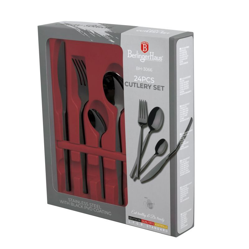 - Materiál: Nerezová oceľ s leštenou povrchovou úpravou - Sada obsahuje: - Nôž 6 ks 7,0 mm - Vidlička 6 ks 4,0 mm - Lyžica 6 ks 4,0 mm - Čajová lyžička 6 ks 2,7 mm - Farba: čierna - elegantný dizajn - Vysoko kvalitná nerezová oceľ s čiernym PVD povlakom - Reprezentatívna darčeková krabička - Zrkadlový leštený povrch
