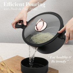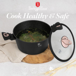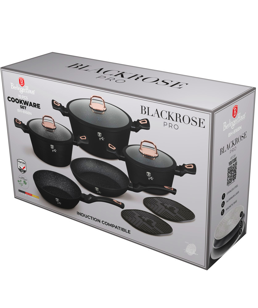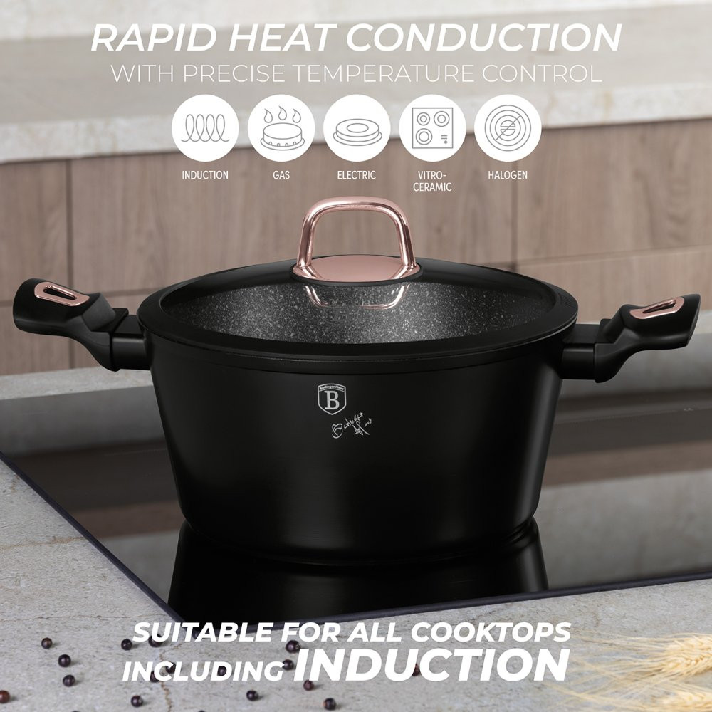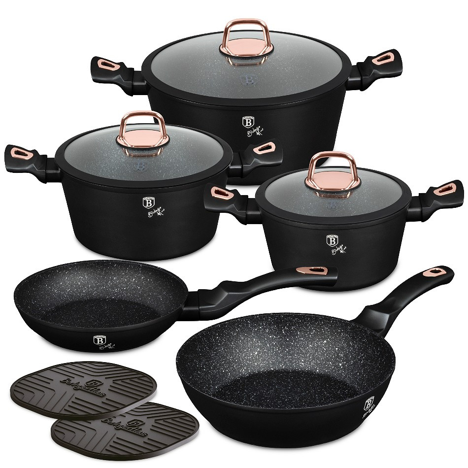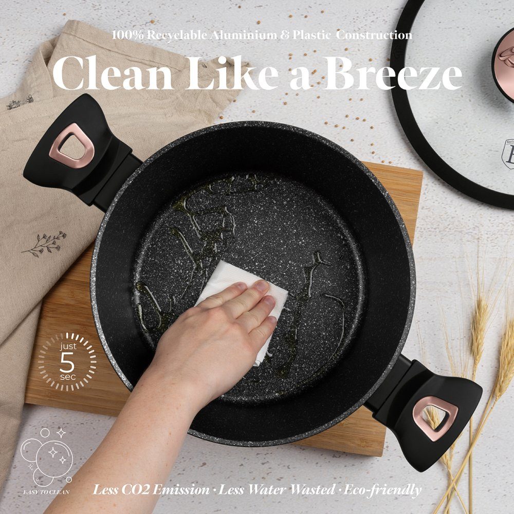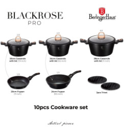 - Magicky čierna sada riadu zo série Black Rose zaujme nielen neprehliadnuteľným moderným dizajnom, ale predovšetkým svojimi jedinečnými vlastnosťami - doménou tejto sady je 3-vrstvový povrch s mramorovým dizajnom charakteristický svojou dokonalou nepriľnavosťou, žiadne potraviny sa nepripaľujú a vďaka tomu sa kastróly aj panvice veľmi ľahko čistia - zároveň je vhodný na zdravé varenie s minimom tuku, v závislosti na použitých surovinách pokojne aj bez jedinej kvapky tuku - vnútorná aj vonkajšia vrstva neobsahujú žiadne škodliviny, výsledné pokrmy tak nestrácajú varením svoje vitamíny - zosilnené nerezové Turbo indukčné dno pre maximálnu efektivitu prípravy pokrmu - energeticky úsporné varenie zaisťuje korpus z odolného kovaného hliníka, ktorý sa rýchlo nahrieva po celom povrchu a má perfektnú tepelnú vodivosť - ušetríte až 35% energie a času oproti obyčajným nerezovým kastrólom - prednosťou sú tiež pokrievky z tvrdeného žiaruvzdorného skla s nerezovým úchopom - ich dokonalý tvar dobre priľne k telu hrnca i panvíc a integrovaný otvor prirodzene reguluje množstvo pary vo vnútri nádoby - rovnakej veľkosti pokrievok možno bez problému použiť aj na rovnako veľké panvice - ergonomicky tvarované rukoväte majú protišmykovú mäkčenú úpravu, vďaka ktorej príjemne padnú do ruky a umožnia pevný a bezpečný úchop - vďaka izolačným prvkom zostávajú rukoväte po celú dobu varenia chladné a nepália - zaoblený prechod medzi dnom a stenami uľahčuje premiešavanie obsahu - telo kastrólov i panvíc je zakončené zosilnenými okrajmi pre lepšiu odolnosť voči nárazom - celá sada je vhodná na všetky druhy sporákov aj na indukciu - vhodné na zapekanie v rúre aj s pokrievkou do maximálnej teploty 160°C - vďaka nadštandardným nepriľnavým vlastnostiam je čistenie rýchle a nenáročné, stačí umyť teplou vodou a hubkou - možno umývať aj v umývačke riadu, na zachovanie dlhotrvajúceho bezchybného stavu sa odporúča šetrný program - hrnce je možné podľa veľkosti vkladať do seba, čo je veľmi výhodné pri skladovaní - ideálny pre každodenné varenie, dusenie a smaženie akýchkoľvek pokrmov - ECOfriendly, použité materiály neobsahujú žiadne škodliviny ako Pfoa, olovo ani kadmium - vysoko atraktívny moderný dizajn v jedinečných metalických farbách - riad je vďaka svojmu perfektnému dizajnu vhodný aj na priame servírovanie pokrmov na stôl - kolekcia: Black Rose Collection - túto sériu je možné doplniť o množstvo jednotlivých kusov riadu, príslušenstva, sady nožov či spotrebičov - kompletná sada 10 ks obsahuje: - panvica 20 x 4,2 cm - hlboká panvica 24 x 6,8 cm - kastról s pokrievkou 20 x 10 cm / 2,5 litra - kastról s pokrievkou 24 x 12 cm / 4,1 litra - kastról s pokrievkou 28 x 12,5 cm / 6,1 litra - 2x podložka pod horúci riad