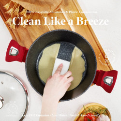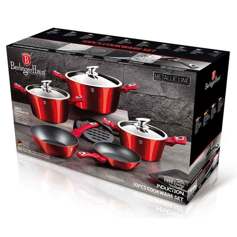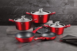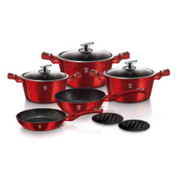 - Výnimočná sada riadu z kolekcie Metallic Line zaujme nielen neprehliadnuteľným moderným dizajnom, ale predovšetkým svojimi jedinečnými vlastnosťami - doménou tejto sady je 3-vrstvový povrch s mramorovým dizajnom charakteristický svojou dokonalou nepriľnavosťou, žiadne potraviny sa nepripaľujú a vďaka tomu sa kastróly aj panvice veľmi ľahko čistia - zároveň je vhodný na zdravé varenie s minimom tuku, v závislosti na použitých surovinách pokojne aj bez jedinej kvapky tuku - vnútorná aj vonkajšia vrstva neobsahujú žiadne škodliviny, výsledné pokrmy tak nestrácajú varením svoje vitamíny - zosilnené nerezové Turbo indukčné dno pre maximálnu efektivitu prípravy pokrmu - energeticky úsporné varenie zaisťuje korpus z odolného kovaného hliníka, ktorý sa rýchlo nahrieva po celom povrchu a má perfektnú tepelnú vodivosť - ušetríte až 35% energie a času oproti obyčajným nerezovým kastrólom - prednosťou sú tiež pokrievky z tvrdeného žiaruvzdorného skla s nerezovým úchopom, ktoré sú po obvode opatrené okrajom z nerezovej ocele 18/10 - ich dokonalý tvar dobre priľne k telu hrnca i panvíc a integrovaný otvor prirodzene reguluje množstvo pary vo vnútri nádoby - rovnakej veľkosti pokrievok možno bez problému použiť aj na rovnako veľké panvice - ergonomicky tvarované rukoväte majú protišmykovú mäkčenú úpravu, vďaka ktorej príjemne padnú do ruky a umožnia pevný a bezpečný úchop - vďaka izolačným prvkom zostávajú rukoväte po celú dobu varenia chladné a nepália - zaoblený prechod medzi dnom a stenami uľahčuje premiešavanie obsahu - telo kastrólov i panvíc je zakončené zosilnenými okrajmi pre lepšiu odolnosť voči nárazom - celá sada je vhodná na všetky druhy sporákov aj na indukciu - vhodné na zapekanie v rúre aj s pokrievkou do maximálnej teploty 160°C - vďaka nadštandardným nepriľnavým vlastnostiam je čistenie rýchle a nenáročné, stačí umyť teplou vodou a hubkou - vhodné tiež do umývačky riadu, na zachovanie dlhotrvajúceho bezchybného stavu sa odporúča šetrný program - hrnce je možné podľa veľkosti vkladať do seba, čo je veľmi výhodné pri skladovaní - ideálny pre každodenné varenie, dusenie a smaženie akýchkoľvek pokrmov - ECOfriendly, použité materiály neobsahujú žiadne škodliviny ako Pfoa, olovo ani kadmium - vysoko atraktívny moderný dizajn v jedinečných metalických farbách - riad je vďaka svojmu perfektnému dizajnu vhodný aj na priame servírovanie pokrmov na stôl - kolekcia: Burgundy Metallic Line - túto sériu je možné doplniť o množstvo jednotlivých kusov riadu, príslušenstva, sady nožov či spotrebičov - kompletná sada 10 ks obsahuje: - panvica 20 x 4,2 cm - hlboká panvica 24 x 6,8 cm - kastról s pokrievkou 20 x 10 cm / 2,5 litra - kastról s pokrievkou 24 x 12 cm / 4,1 litra - kastról s pokrievkou 28 x 12,5 cm / 6,1 litra - 2x podložka pod horúci riad Hľadáte vhodnú sadu riadu do vašej kuchyne? Sadou získate všetky potrebné nádoby na varenie , či už budete variť pre seba alebo pre viac osôb. Veľkou výhodou je, že môžete objednať naraz viac riadu od overeného výrobcu BERLINGERHAUS. Sadu riadu zjednocuje jednotný dizajn , navyše červená farba celej sady je univerzálna a vynímať sa bude v každej kuchyni. Súprava riadu s mramorovým povrchom 10 ks Burgundy Metallic Line dodá vášmu vareniu nový rozmer Budete môcť variť rôzne jedlá súčasne a tým ušetríte čas a efektívne budete využívať aj kuchynskú plochu. Budete mať na jednom mieste riad vhodný na varenie rôznych druhov pokrmov – dusenie mäsa, varenie polievok, ryže, cestovín alebo na prípravu omáčok.