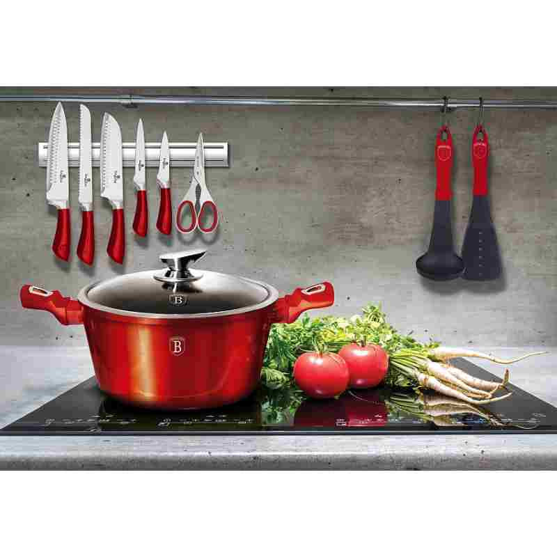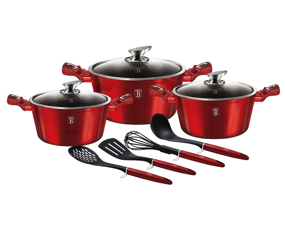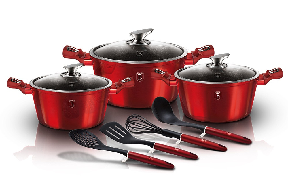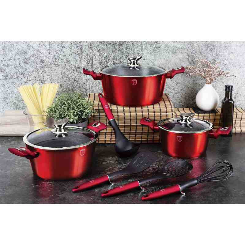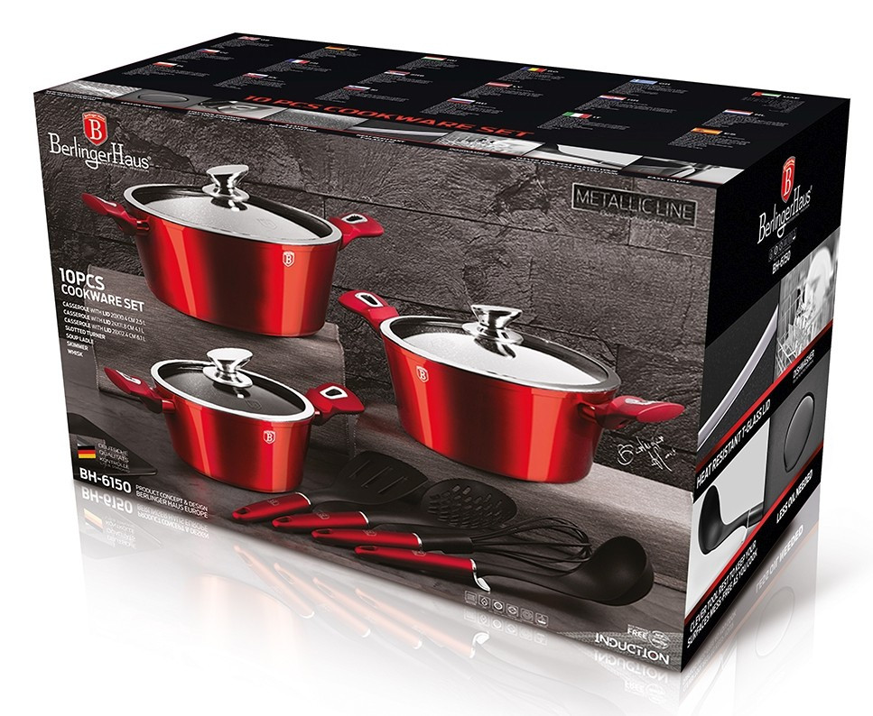 - Výnimočná súprava riadu z kolekcie Metallic Line zaujme nielen svojím nezameniteľným moderným dizajnom, ale predovšetkým svojimi jedinečnými vlastnosťami- doménou tejto súpravy je 3-vrstvový povrch s mramorovým vzorom, ktorý sa vyznačuje dokonalou nepriľnavosťou, žiadne jedlo sa nepripaľuje a vďaka tomu sa pekáče a panvice veľmi ľahko čistia- je vhodná aj na zdravé varenie s minimálnym množstvom tuku, v závislosti od použitých surovín aj bez jedinej kvapky tuku- vnútorná a vonkajšia vrstva neobsahuje žiadne škodlivé látky, takže výsledné jedlo počas varenia nestráca vitamíny- zosilnená indukčná základňa Turbo z nehrdzavejúcej ocele pre maximálnu účinnosť varenia- energeticky úsporné varenie zabezpečuje odolné kované hliníkové teleso, ktoré sa rýchlo zahrieva po celej ploche a má dokonalú tepelnú vodivosť- ušetrí až 35 % energie a času v porovnaní s bežnými kastrólmi z nehrdzavejúcej ocele- výhodou sú aj pokrievky z tvrdeného žiaruvzdorného skla s úchytom z nehrdzavejúcej ocele a okrajom z nehrdzavejúcej ocele 18/10 po obvode- ich dokonalý tvar dobre prilieha k telu hrnca a integrovaný otvor prirodzene reguluje množstvo pary vo vnútri hrnca- ergonomicky tvarované rukoväte majú protišmykovú zmäkčenú úpravu, vďaka ktorej sa pohodlne držia v ruke a umožňujú pevné a bezpečné uchopenie- vďaka izolačným prvkom zostávajú rukoväte počas celého procesu varenia chladné a nepripaľujú sa- zaoblený prechod medzi dnom a stenami uľahčuje miešanie obsahu- telo kastróla je zakončené zosilnenými okrajmi pre lepšiu odolnosť voči nárazom- celá súprava je vhodná pre všetky typy sporákov a indukciu- vhodný na pečenie v rúre a s pokrievkou do maximálnej teploty 160 °C- vďaka vynikajúcim nepriľnavým vlastnostiam je čistenie rýchle a jednoduché, stačí umyť teplou vodou a hubkou- možno umývať aj v umývačke riadu- hrnce sa dajú stohovať podľa veľkosti, čo je veľmi pohodlné pri skladovaní- ideálne na každodenné varenie, dusenie a vyprážanie všetkých druhov potravín- Šetrné k životnému prostrediu, použité materiály neobsahujú žiadne škodliviny, ako je Pfoa, olovo alebo kadmium- veľmi atraktívny moderný dizajn v jedinečných metalických farbách- vďaka dokonalému dizajnu je riad vhodný aj na servírovanie jedla priamo na stôl- kolekcia: Burgundy Metallic Line- túto sériu možno doplniť mnohými jednotlivými kusmi riadu, doplnkami, súpravami nožov alebo spotrebičmi- kompletná sada 10 kusov obsahuje:- kastról s pokrievkou 20 x 10 cm / 2,5 l- kastról s pokrievkou 24 x 12 cm / 4,1 litra- kastról s pokrievkou 28 x 12,5 cm / 6,1 litra- obracačka- šľahacia metla- naberačka na polievku- perforovaná lyžicaHľadáte tú správnu súpravu riadu do vašej kuchyne? Táto súprava vám poskytne všetko potrebné kuchynské náčinie, či už varíte pre seba alebo pre viacero osôb. Veľkou výhodou je, že si môžete objednať hneď niekoľko kusov riadu od osvedčeného výrobcu BerlingerHaus. Súprava kuchynského riadu je zjednotená jednotným dizajnom, navyše červená farba celej súpravy je univerzálna a vynikne v každej kuchyni.Desaťdielna súprava riadu Burgundy Metallic Line s mramorovým povrchom dodá vášmu vareniu nový rozmerBudete môcť variť rôzne jedlá súčasne, čím ušetríte čas a efektívne využijete priestor v kuchyni. Na jednom mieste budete mať správne náčinie na prípravu rôznych druhov jedál - dusenie mäsa, varenie polievok, ryže, cestovín alebo prípravu omáčok.