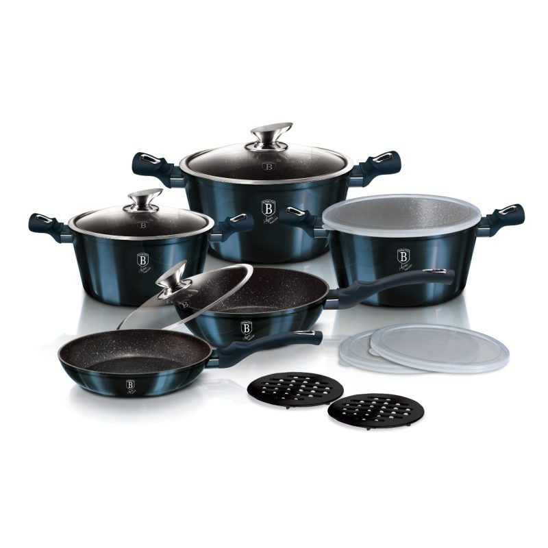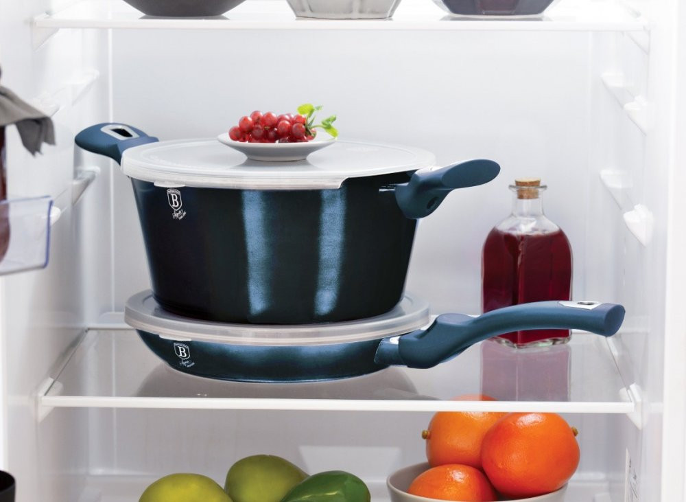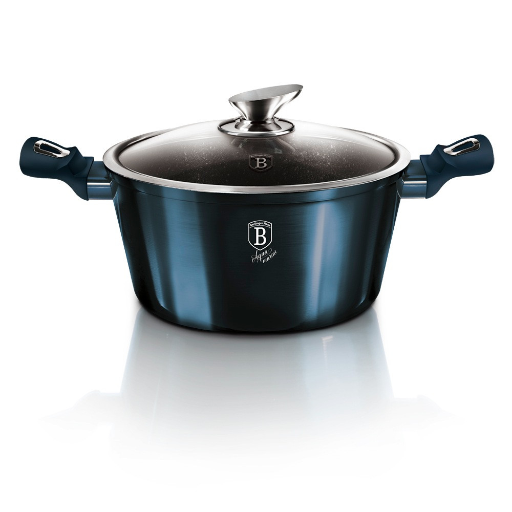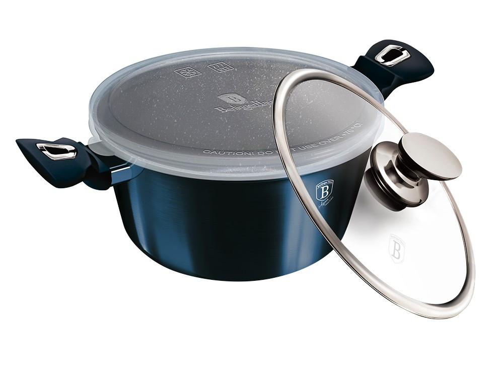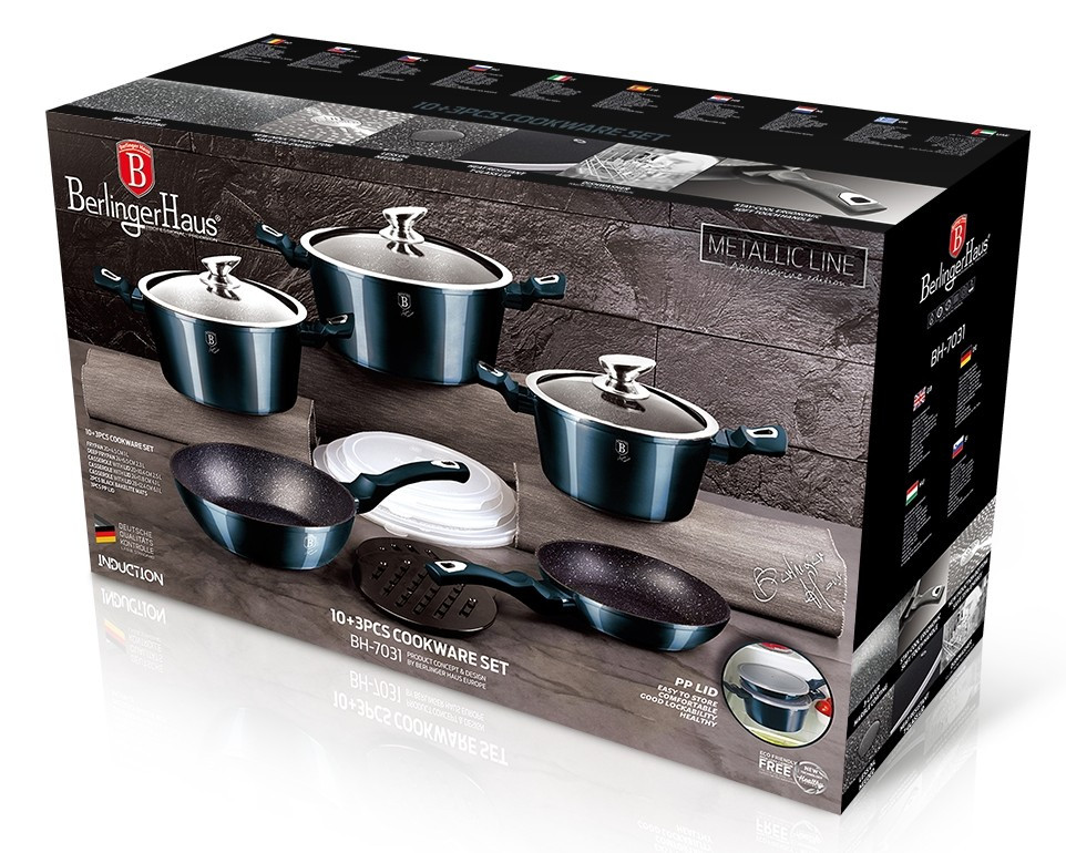 - Výnimočná sada riadu z kolekcie Metallic Line zaujme nielen neprehliadnuteľným moderným dizajnom, ale predovšetkým svojimi jedinečnými vlastnosťami - doménou tejto sady je 3-vrstvový povrch s mramorovým dizajnom charakteristický svojou dokonalou nepriľnavosťou, žiadne potraviny sa nepripaľujú a vďaka tomu sa kastróly aj panvice veľmi ľahko čistia - zároveň je vhodný na zdravé varenie s minimom tuku, v závislosti na použitých surovinách pokojne aj bez jedinej kvapky tuku - vnútorná aj vonkajšia vrstva neobsahujú žiadne škodliviny, výsledné pokrmy tak nestrácajú varením svoje vitamíny - zosilnené nerezové Turbo indukčné dno pre maximálnu efektivitu prípravy pokrmu - energeticky úsporné varenie zaisťuje korpus z odolného kovaného hliníka, ktorý sa rýchlo nahrieva po celom povrchu a má perfektnú tepelnú vodivosť - ušetríte až 35% energie a času oproti obyčajným nerezovým kastrólom - prednosťou sú tiež pokrievky z tvrdeného žiaruvzdorného skla s nerezovým úchopom, ktoré sú po obvode opatrené okrajom z nerezovej ocele 18/10 - ich dokonalý tvar dobre priľne k telu hrnca i panvíc a integrovaný otvor prirodzene reguluje množstvo pary vo vnútri nádoby - rovnakej veľkosti pokrievok možno bez problému použiť aj na rovnako veľké panvice - ergonomicky tvarované rukoväte majú protišmykovú mäkčenú úpravu, vďaka ktorej príjemne padnú do ruky a umožnia pevný a bezpečný úchop - vďaka izolačným prvkom zostávajú rukoväte po celú dobu varenia chladné a nepália - zaoblený prechod medzi dnom a stenami uľahčuje premiešavanie obsahu - telo kastrólov i panvíc je zakončené zosilnenými okrajmi pre lepšiu odolnosť voči nárazom - celá sada je vhodná na všetky druhy sporákov aj na indukciu - vhodné na zapekanie v rúre aj s pokrievkou do maximálnej teploty 160°C - vďaka nadštandardným nepriľnavým vlastnostiam je čistenie rýchle a nenáročné, stačí umyť teplou vodou a hubkou - vhodné tiež do umývačky riadu, na zachovanie dlhotrvajúceho bezchybného stavu sa odporúča šetrný program - hrnce je možné podľa veľkosti vkladať do seba, čo je veľmi výhodné pri skladovaní - ideálny pre každodenné varenie, dusenie a smaženie akýchkoľvek pokrmov - ECOfriendly, použité materiály neobsahujú žiadne škodliviny ako Pfoa, olovo ani kadmium - vysoko atraktívny moderný dizajn v jedinečných metalických farbách - riad je vďaka svojmu perfektnému dizajnu vhodný aj na priame servírovanie pokrmov na stôl - kolekcia: Aquamarine Metallic Line - túto sériu je možné doplniť o množstvo jednotlivých kusov riadu, príslušenstva, sady nožov či spotrebičov - kompletná sada 13 ks obsahuje: - panvica 20 x 4,2 cm - hlboká panvica 24 x 6,5 cm - kastról s pokrievkou 20 x 10 cm / 2,5 litra - kastról s pokrievkou 24 x 12 cm / 4,1 litra - kastról s pokrievkou 28 x 12,5 cm / 6,1 litra - 3x skladovacie viečko na panvice aj hrnce - 2x podložka pod horúci riad Hľadáte vhodnú sadu riadu do vašej kuchyne? Sadou získate všetky potrebné nádoby na varenie , či už budete variť pre seba alebo pre viac osôb. Veľkou výhodou je, že môžete objednať naraz viac riadu od overeného výrobcu BERLINGERHAUS. Sadu riadu zjednocuje jednotný dizajn , navyše modrá farba celej sady je univerzálna a vynímať sa bude v každej kuchyni. Sada riadu s mramorovým povrchom 13 ks Aquamarine Metallic Line dodá vášmu vareniu nový rozmer Budete môcť variť rôzne jedlá súčasne a tým ušetríte čas a efektívne budete využívať aj kuchynskú plochu. Budete mať na jednom mieste riad vhodný na varenie rôznych druhov pokrmov – dusenie mäsa, varenie polievok, ryže, cestovín alebo na prípravu omáčok.