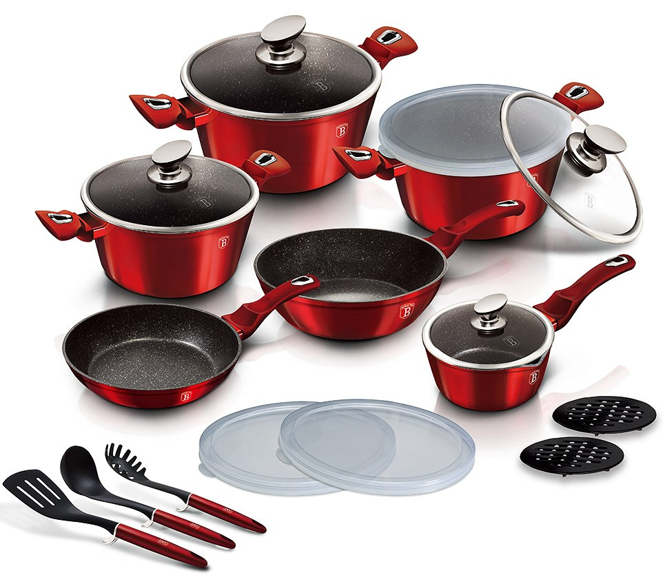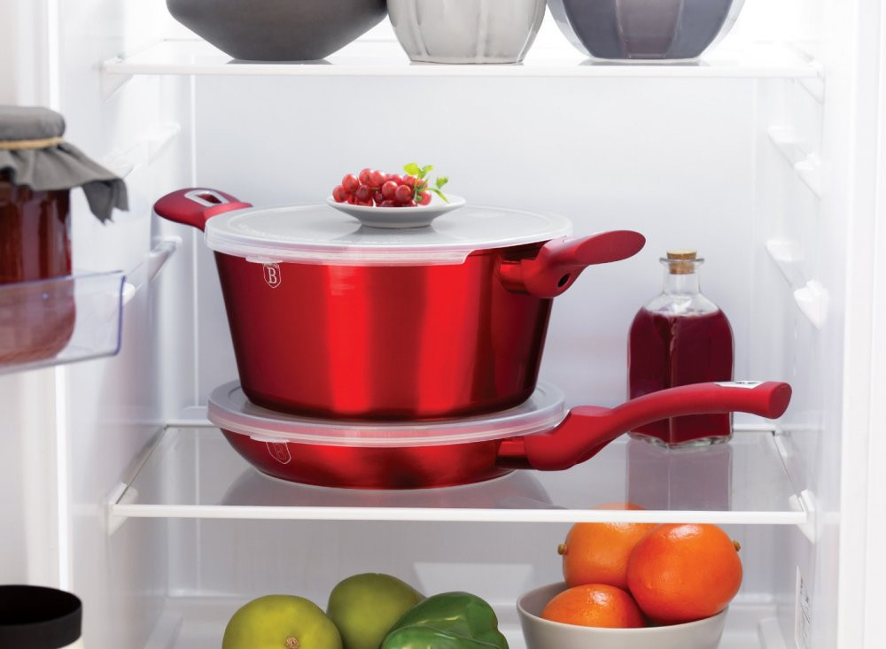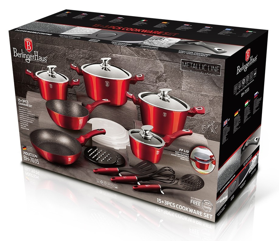 Bohato vybavená sada riadu z metalickej burgundy kolekcie zaujme nielen neprehliadnuteľným moderným dizajnom, ale predovšetkým svojimi jedinečnými vlastnosťami. V sade sú navyše 3 praktické viečka, ktorými je možné nádoby uzavrieť. - doménou tejto sady je 3-vrstvový povrch s mramorovým dizajnom charakteristický svojou dokonalou nepriľnavosťou, žiadne potraviny sa nepripaľujú a vďaka tomu sa kastróly aj panvice veľmi ľahko čistia - zároveň je vhodný na zdravé varenie s minimom tuku, v závislosti na použitých surovinách pokojne aj bez jedinej kvapky tuku - vnútorná aj vonkajšia vrstva neobsahujú žiadne škodliviny, výsledné pokrmy tak nestrácajú varením svoje vitamíny - zosilnené nerezové Turbo indukčné dno pre maximálnu efektivitu prípravy pokrmu - energeticky úsporné varenie zaisťuje korpus z odolného kovaného hliníka, ktorý sa rýchlo nahrieva po celom povrchu a má perfektnú tepelnú vodivosť - ušetríte až 35% energie a času oproti obyčajným nerezovým kastrólom - prednosťou sú tiež pokrievky z tvrdeného žiaruvzdorného skla s nerezovým úchopom, ktoré sú po obvode opatrené okrajom z nerezovej ocele 18/10 - ich dokonalý tvar dobre priľne k telu hrnca i panvíc a integrovaný otvor prirodzene reguluje množstvo pary vo vnútri nádoby - rovnakej veľkosti pokrievok možno bez problému použiť aj na rovnako veľké panvice - ergonomicky tvarované rukoväte majú protišmykovú mäkčenú úpravu, vďaka ktorej príjemne padnú do ruky a umožnia pevný a bezpečný úchop - vďaka izolačným prvkom zostávajú rukoväte po celú dobu varenia chladné a nepália - zaoblený prechod medzi dnom a stenami uľahčuje premiešavanie obsahu - telo kastrólov i panvíc je zakončené zosilnenými okrajmi pre lepšiu odolnosť voči nárazom - celá sada je vhodná na všetky druhy sporákov aj na indukciu - vhodné na zapekanie v rúre aj s pokrievkou do maximálnej teploty 160°C - vďaka nadštandardným nepriľnavým vlastnostiam je čistenie rýchle a nenáročné, stačí umyť teplou vodou a hubkou - vhodné tiež do umývačky riadu, na zachovanie dlhotrvajúceho bezchybného stavu sa odporúča šetrný program - hrnce je možné podľa veľkosti vkladať do seba, čo je veľmi výhodné pri skladovaní - súčasťou sady je aj funkčne jedinečné kuchynské náčinie z nylonu, ktoré nikdy nepoškriabe Váš riad, navyše má uprostred praktickú nožičku, vďaka ktorej je hlavica náčinia vo vzduchu, takže si pri jeho položení nezašpiníte kuchynskú linku - ideálny pre každodenné varenie, dusenie a smaženie akýchkoľvek pokrmov - ECOfriendly, použité materiály neobsahujú žiadne škodliviny ako Pfoa, olovo ani kadmium - vysoko atraktívny moderný dizajn v jedinečných metalických farbách - riad je vďaka svojmu perfektnému vzhľadu vhodný aj na priame servírovanie pokrmov na stôl - kolekcia: Burgundy Metallic Line - túto sériu je možné doplniť o množstvo jednotlivých kusov riadu, príslušenstva, sady nožov či spotrebičov - kompletná sada 18 ks obsahuje: - panvica 28 x 5,2 cm - hlboká panvica 24 x 6,8 cm / 2,3 litra - rajnica s pokrievkou 16 x 8,5 cm / 1,2 litra - kastról s pokrievkou 20 x 10 cm / 2,5 litra - kastról s pokrievkou 24 x 12 cm / 4,1 litra - kastról s pokrievkou 28 x 12,5 cm / 6,1 litra - 3x kuchynské náčinie, naberačka na polievku, obracačka a naberačka na cestoviny - 3x skladovacie viečko na hrnce aj panvice - 2x podložka pod horúci riad Hľadáte vhodnú sadu riadu do vašej kuchyne? Sadou získate všetky potrebné nádoby na varenie , či už budete variť pre seba alebo pre viac osôb. Veľkou výhodou je, že môžete objednať naraz viac riadu od overeného výrobcu BERLINGERHAUS. Sadu riadu zjednocuje jednotný dizajn , navyše červená farba celej sady je univerzálna a vynímať sa bude v každej kuchyni. Sada riadu s mramorovým povrchom 18 ks Burgundy Metallic Line dodá vášmu vareniu nový rozmer Budete môcť variť rôzne jedlá súčasne a tým ušetríte čas a efektívne budete využívať aj kuchynskú plochu. Budete mať na jednom mieste riad vhodný na varenie rôznych druhov pokrmov – dusenie mäsa, varenie polievok, ryže, cestovín alebo na prípravu omáčok.