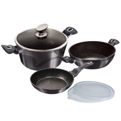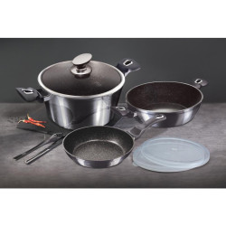 - základná sada riadu z kolekcie Carbon PRO v metalickej šedej farbe - doménou tejto sady je 3-vrstvový nepriľnavý povrch s mramorovým dizajnom, charakteristický dokonalou nepriľnavosťou, žiadne potraviny sa nepripaľujú a vďaka tomu sa kastróly aj panvice veľmi ľahko čistia - zároveň je vhodný na zdravé varenie s minimom tuku, v závislosti na použitých surovinách pokojne aj bez jedinej kvapky tuku - vnútorná aj vonkajšia vrstva neobsahujú žiadne škodliviny, výsledné pokrmy tak nestrácajú varením svoje vitamíny - zosilnené nerezové Turbo indukčné dno pre maximálnu efektivitu prípravy pokrmu - energeticky úsporné varenie zaisťuje korpus z odolného kovaného hliníka, ktorý sa rýchlo nahrieva po celom povrchu a má perfektnú tepelnú vodivosť - ušetríte až 35% energie a času oproti obyčajným nerezovým kastrólom - prednosťou je tiež pokrievka z tvrdeného žiaruvzdorného skla s nerezovým úchopom - jej dokonalý tvar dobre priľne k telu hrnca i panvíc a integrovaný otvor prirodzene reguluje množstvo pary vo vnútri nádoby - rovnakej veľkosti pokrievok možno bez problému použiť aj na rovnako veľké panvice - ergonomicky tvarované rukoväte majú protišmykovú mäkčenú úpravu, vďaka ktorej príjemne padnú do ruky a umožnia pevný a bezpečný úchop - vďaka izolačným prvkom zostávajú rukoväte po celú dobu varenia chladné a nepália - zaoblený prechod medzi dnom a stenami uľahčuje premiešavanie obsahu - telo kastrólov i panvíc je zakončené zosilnenými okrajmi pre lepšiu odolnosť voči nárazom - celá sada je vhodná na všetky druhy sporákov aj na indukciu - vhodné na zapekanie v rúre aj s pokrievkou do maximálnej teploty 160°C - vďaka nadštandardným nepriľnavým vlastnostiam je čistenie rýchle a nenáročné, stačí umyť teplou vodou a hubkou - vhodné tiež do umývačky riadu, na zachovanie dlhotrvajúceho bezchybného stavu sa odporúča šetrný program - hrnce je možné podľa veľkosti vkladať do seba, čo je veľmi výhodné pri skladovaní - ideálny pre každodenné varenie, dusenie a smaženie akýchkoľvek pokrmov - ECOfriendly, použité materiály neobsahujú žiadne škodliviny ako Pfoa, olovo ani kadmium - riad je vďaka svojmu perfektnému dizajnu vhodný aj na priame servírovanie pokrmov na stôl - kolekcia: Carbon PRO Line - túto sériu je možné doplniť o množstvo jednotlivých kusov riadu, príslušenstva, sady nožov či spotrebičov - kompletná sada 6 ks obsahuje: - pekáč hlboký 24 x 6,5 cm / 3,2 l - kastról 24 x 12 cm / 4,1 litra - panvica 24 x 4,5 cm - sklenená pokrievka 24 cm - 2 x skladovacie veko 24 cm