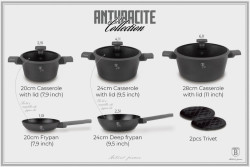 - Materiál: kovaný hliník s nepriľnavým povrchom titánPro - Súčasťou balenia je: - Panvica pr. 20*4,5 cm 1,0 l. - Hlboká panvica pr. 24*6,5 cm 2,3L - Kastról s cediacou pokrievkou pr. 20*10,4 cm 2,5L - Kastról s cediacou pokrievkou pr. 24*11,8 cm 4,1L - Kastról s cediacou pokrievkou pr. 28*12,4 cm 6,1L - 2 ks čierne bakelitové podložky pod hrniec - Farba: matný antracit - trojvrstvový odolný nepriľnavý povrch titánPro - Ergonomická rukoväť a gombík s mäkkým dotykom Stay Cool - Veko z tvrdeného skla s tepelne odolným silikónovým systémom Soft Close - Otvor na odvod pary - Minimalistický štýl - Matná povrchová úprava - Na báze turboindukcie - Vhodné pre všetky typy varných dosiek - Šetrný k životnému prostrediu Neobsahuje PFOA, LEAD, kadmium - Ľahko sa čistí