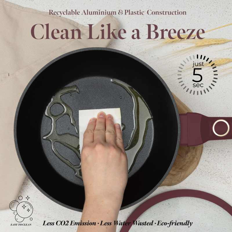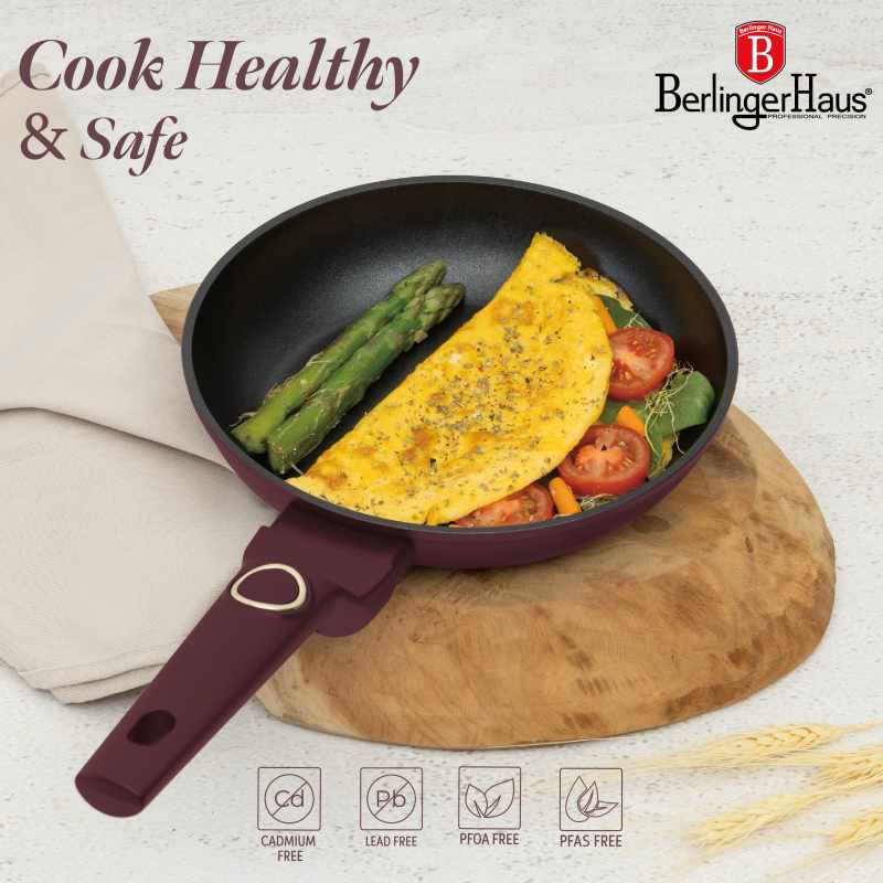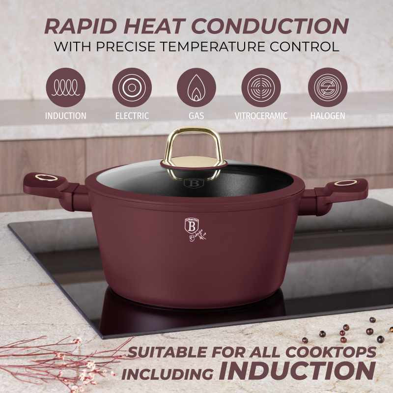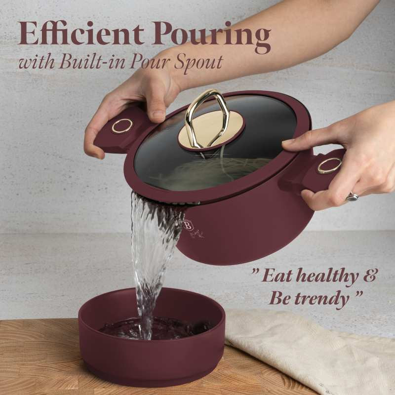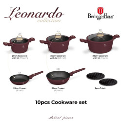 Súprava riadu s titánovým povrchom 10 ks Leonardo Collection – odolnosť a elegancia v kuchyni Chcete variť ľahko a bez pripaľovania? Súprava riadu Leonardo Collection s nepriľnavým titánovým povrchom TitanPro zaistí dokonalé výsledky a jednoduchú údržbu. Vďaka turboindukčnému dnu je vhodná pre všetky typy sporákov a umožňuje rovnomerný ohrev. Prečo si ju obľúbite? Nepriľnavý titánový povrch TitanPro – zdravé varenie s minimom tuku Odolný kovaný hliník – rýchle zahriatie a dlhá životnosť Cediaca pokrievka s odvodom pary – ľahké zlievanie vody bez potreby cedníka Ergonomické rukoväte Stay Cool – pohodlné držanie a odolnosť voči zahrievaniu Univerzálne použitie - vhodné pre všetky typy varných dosiek vrátane indukcie Obsah sady: Panvica 20 cm (1,0 l) Hlboká panvica 24 cm (2,3 l) Kastról s cediacou pokrievkou 20 cm (2,5 l) Kastról s cediacou pokrievkou 24 cm (4,1 l) Kastról s cediacou pokrievkou 28 cm (6,1 l) 2× čierne bakelitové podložky pod hrniec Ďalšie vlastnosti: Farba: matná bordová Materiál: kovaný hliník s titánovým povrchom Bezpečné zloženie - neobsahuje PFOA, olovo ani kadmium Jednoduché čistenie - rýchla údržba a dlhá životnosť Moderná a praktická sada riadu, s ktorou bude každé varenie radosťou.