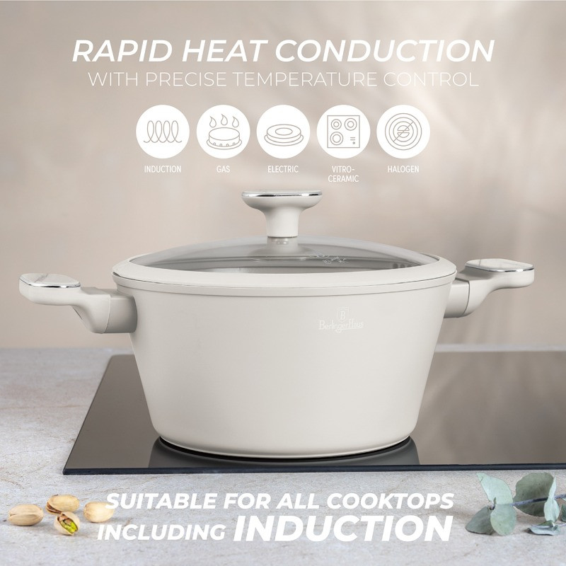 Súprava riadu 10 ks BERLINGERHAUS BH-8400 Sahara Marble Collection – Kameň, elegancia a sila v jednej sade. Mramorová krása, ktorá sa nestratí v žiadnej kuchyni Sahara Marble Collection prináša kombináciu matného krémového povrchu a elegantného mramorového efektu. Táto sada je nielen estetickým skvostom, ale aj výkonným nástrojom pre každodenné varenie. S čím môžete počítať? • Panvica priemer 20 × 4,5 cm / 1,0 l – ideálna pre rýchle vyprážanie • Hlboká panvica priemer 24 × 6,5 cm / 2,3 l – pre dusené a výdatné pokrmy • Kastról s vekom a sitkom priemer 20 × 11 cm / 2,6 l • Kastról s vekom a sitkom priemer 24 × 12,5 cm / 4,3 l • Kastról s vekom a sitkom priemer 28 × 13 cm / 6,3 l • 2× silikónová podložka v krémovej farbe – štýlové a praktické TitanPro – pretože odolnosť je základ Trojvrstvový titánový povrch je navrhnutý tak, aby vydržal každodenné výzvy. Nelepí, nepripaľuje, ľahko sa čistí a pritom neobsahuje škodliviny - pre zdravšie a pohodlnejšie varenie. Rukoväte s mäkkým dotykom Ergonomické držadlá s efektom svetlého dreva nielen skvele vyzerajú, ale aj zostávajú chladné. S každým pohybom cítite istotu a komfort. Múdre veká s funkciou cedenia Tvrdené sklo, parný ventil, silikónové tesnenie a možnosť zlievania - jednoduché, bezpečné a efektívne. Ušetrí vám prácu aj riad navyše. Indukčná turbo základňa Každý kus je vybavený dnom s rýchlym prenosom tepla. Varenie je efektívne, či už máte indukciu, plyn alebo sklokeramiku. Ekologická aj štýlová voľba Bez PFOA, olova a kadmia. Ekologicky šetrné materiály v nádhernom škandinávskom prevedení. Prečo si zamilujete BH-8324 Sahara Nordic? • TitanPro – extra odolný povrch pre ľahké a zdravé varenie • Severský vzhľad – prírodná elegancia s nádychom luxusu • Praktické kastróly s vekami a cedníky • Silikónové podložky vo farbe sady • Univerzálne použitie na všetky typy sporákov Sahara Nordic Collection – Štýlová výbava pre tých, ktorí milujú čistý dizajn a maximálnu praktickosť.