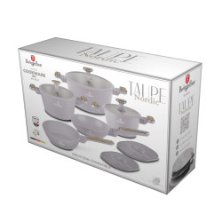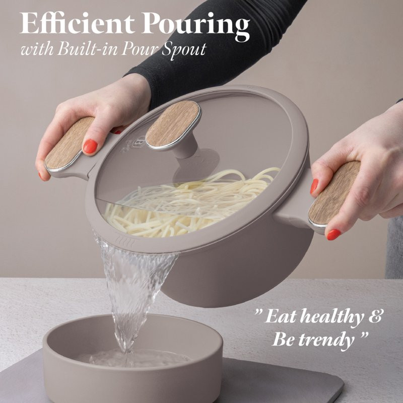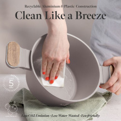 Súprava riadu 10 ks BERLINGERHAUS BH-8323 Taupe Nordic Collection – Pokoj severu. Hrejivosť domova. Škandinávska čistota s dotykom púšte Objavte dokonalú harmóniu funkčnosti a jemného severského designu s kolekciou Sahara Nordic. Matná šedohnedá farba v kombinácii s jemnými tónmi svetlého dreva prináša do vašej kuchyne prirodzenú krásu a hrejivú eleganciu. S čím môžete počítať? • Panvica priemer 20 × 4,5 cm / 1,0 l – ideálna pre rýchle vyprážanie • Hlboká panvica priemer 24 × 6,5 cm / 2,3 l – pre dusené a výdatné pokrmy • Kastról s vekom a sitkom priemer 20 × 11 cm / 2,6 l • Kastról s vekom a sitkom priemer 24 × 12,5 cm / 4,3 l • Kastról s vekom a sitkom priemer 28 × 13 cm / 6,3 l • 2× silikónová podložka v šedohnedej farbe – štýlové a praktické TitanPro – pretože odolnosť je základ Trojvrstvový titánový povrch je navrhnutý tak, aby vydržal každodenné výzvy. Nelepí, nepripaľuje, ľahko sa čistí a pritom neobsahuje škodliviny - pre zdravšie a pohodlnejšie varenie. Rukoväte s mäkkým dotykom Ergonomické držadlá s efektom svetlého dreva nielen skvele vyzerajú, ale aj zostávajú chladné. S každým pohybom cítite istotu a komfort. Múdre veká s funkciou cedenia Tvrdené sklo, parný ventil, silikónové tesnenie a možnosť zlievania - jednoduché, bezpečné a efektívne. Ušetrí vám prácu aj riad navyše. Indukčná turbo základňa Každý kus je vybavený dnom s rýchlym prenosom tepla. Varenie je efektívne, či už máte indukciu, plyn alebo sklokeramiku. Ekologická aj štýlová voľba Bez PFOA, olova a kadmia. Ekologicky šetrné materiály v nádhernom škandinávskom prevedení. Prečo si zamilujete BH-8324 Sahara Nordic? • TitanPro – extra odolný povrch pre ľahké a zdravé varenie • Severský vzhľad – prírodná elegancia s nádychom luxusu • Praktické kastróly s vekami a cedníky • Silikónové podložky vo farbe sady • Univerzálne použitie na všetky typy sporákov Sahara Taupe Collection – Štýlová výbava pre tých, ktorí milujú čistý dizajn a maximálnu praktickosť.