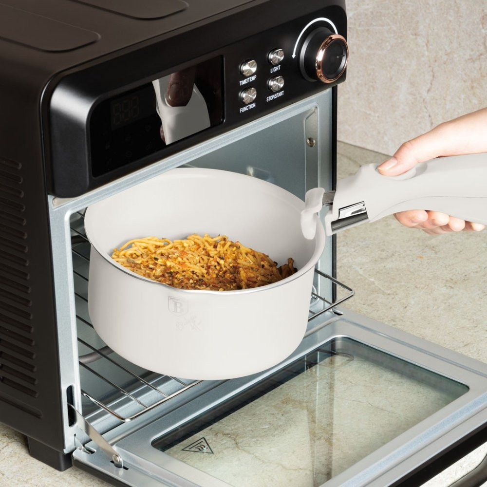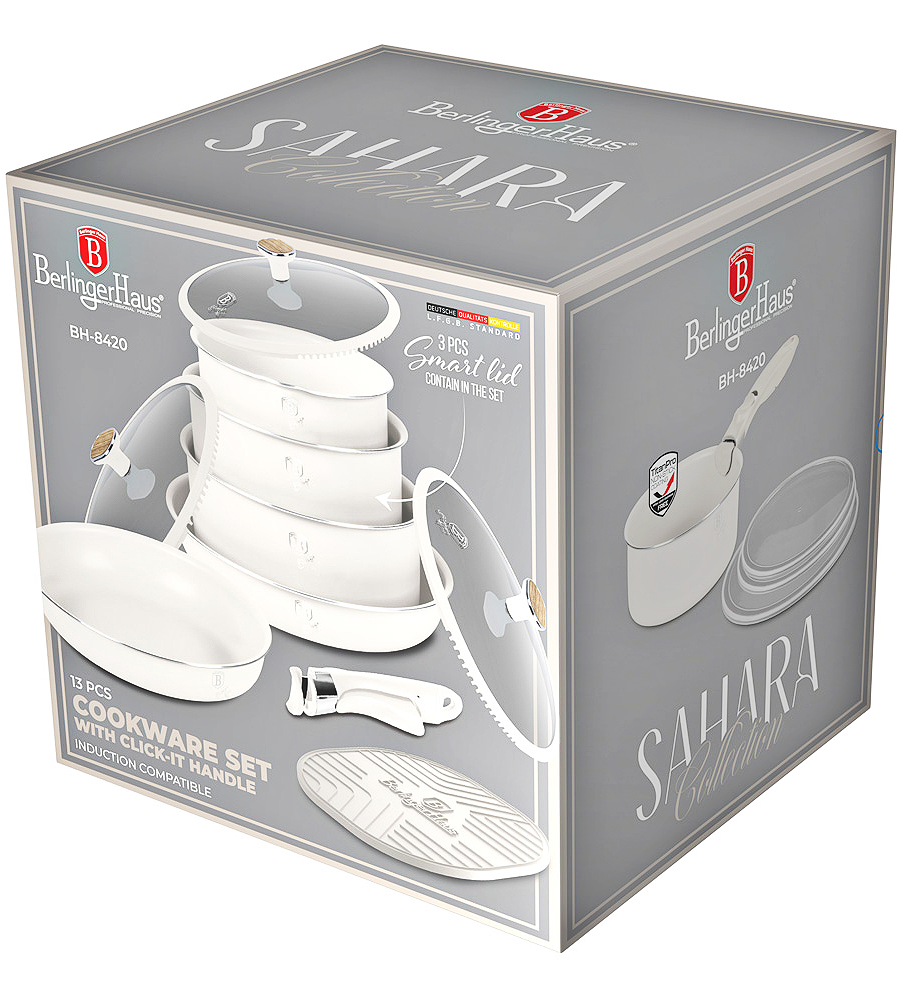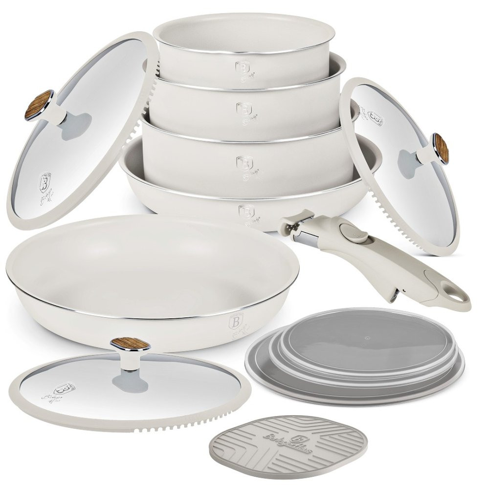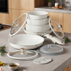 Súprava riadu Berlinger Haus - TitanPro Kliknite na tlačidloObjavte súpravu riadu Berlinger Haus, ktorá spája praktickosť, moderné technológie a elegantný dizajn. Táto súprava zvládne všetko od vyprážania a dusenia až po pečenie. Stohovateľná konštrukcia šetrí miesto v kuchyni a dômyselné pokrievky Click It zabezpečujú bezpečnú a pohodlnú manipuláciu pri varení. Ergonomické mäkké dotykové gombíky a rukoväte zostávajú chladné, takže varenie je pohodlné a bezpečné.Matný povrch v kombinácii krémovej farby a dreva dodáva súprave štýlový a moderný vzhľad, zatiaľ čo turboindukčná základňa zabezpečuje rýchle a rovnomerné varenie. Pokrievky z tvrdeného skla so silikónovým systémom Soft Close umožňujú bezpečné zatváranie a kontrolu varenia.Obsah súpravy:- Panvica s priemerom 24 cm x 4,8 cm - 1,7 l- Panvica s pokrievkou (cedník) priemer 28 cm x 5,2 cm - 2,4 l- Hrniec s hrdlom priemer 16 cm x 7,5 cm - 1,2 l- Hrniec s pokrievkou (cedník) priemer 18 cm x 7,9 cm - 1,7 l- Hrniec s pokrievkou (cedník) priemer 20 cm x 8,4 cm - 2,2 l- 3 ks inteligentných pokrievok- 1 ks krémová silikónová podložkaŠpecifikácia:- Materiál: hliník s 3-vrstvovým nepriľnavým povrchom TitanPro- Ergonomický Soft Touch gombík so striebornou vložkou a farbou svetlého dreva - zostáva chladný- Pokrievka z tvrdeného skla so žiaruvzdorným silikónovým systémom Soft Close- Bezpečné v rúre bez pokrievky a rukoväte Click It- Otvor na paru- Minimalistický štýl, matný povrch- Turboindukcia pre rýchle a rovnomerné varenie- Šetrný k životnému prostrediu - neobsahuje PFOA, olovo a kadmium- Ľahko sa čistíPraktická a štýlová súprava riadu na každodenné varenie s maximálnym komfortom a bezpečnosťou.
