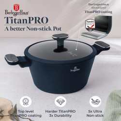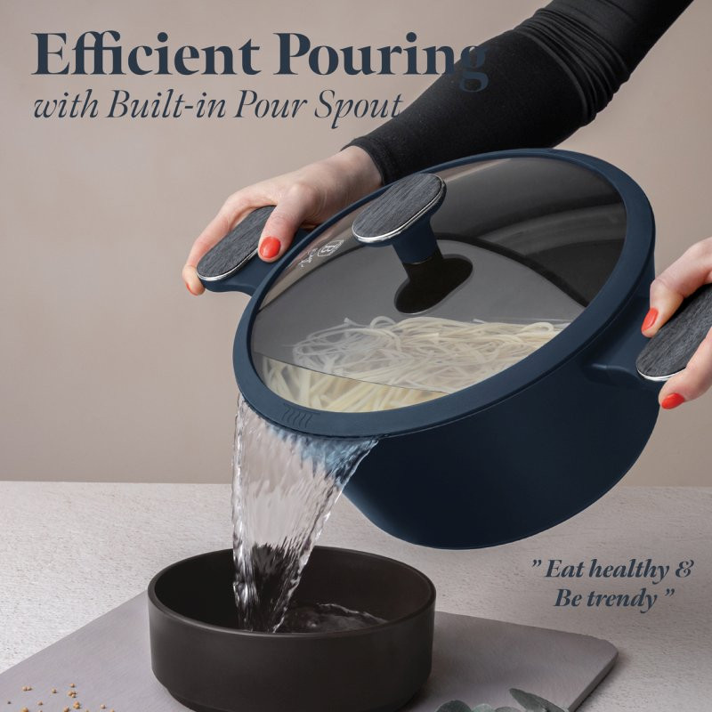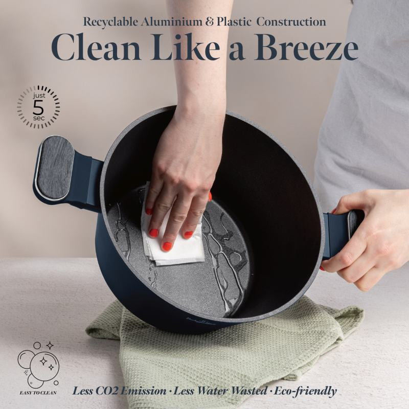 Dokonalá výbava pre vašu kuchyňu - štýlová, praktická a extrémne odolná! Súprava riadu BERLINGERHAUS BH-8382 z kolekcie Deep Sea ponúka všetko, čo potrebujete pre každodenné aj slávnostné varenie. Spája elegantný dizajn, vysokú kvalitu a titánový nepriľnavý povrch, ktorý si zamilujete. Technické parametre • Materiál: kovaný hliník s nepriľnavým povrchom TitanPro • Farba: matná modrá, šedá drevená Obsah sady • Hlboká panvica o24×6,5 cm – 2,3 l • Panvica o28×5,2 cm – 2,4 l • Kastról s pokrievkou a sitkom o20×11 cm – 2,6 l • Kastról s pokrievkou a sitkom o24×12,5 cm – 4,3 l • Kastról s pokrievkou a sitkom o28×13 cm – 6,3 l • Hrniec s pokrievkou o16×7,5 cm – 1,2 l • 3 ks kuchynského náčinia: obracačka s drážkami, naberačka na špagety, naberačka na polievku • 2 ks čiernych silikónových podložiek Vlastnosti • 3x odolný nepriľnavý povrch TitanPro – varenie bez pripaľovania • Ergonomické rukoväte a gombíky s mäkkým dotykom a chladivým efektom • Veká z tvrdeného skla s tepelne odolným silikónovým tesnením a otvorom pre paru • Elegantný matný dizajn v minimalistickom štýle • Indukčné turbo dno – rýchlejší a úspornejší ohrev • Vhodné pre všetky typy varných dosiek • Ekologicky šetrné prevedenie – bez PFOA, olova a kadmia • Jednoduché čistenie Táto sada premení každé varenie na zážitok – spoľahnite sa na kvalitu, ktorá vydrží.