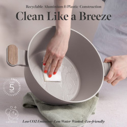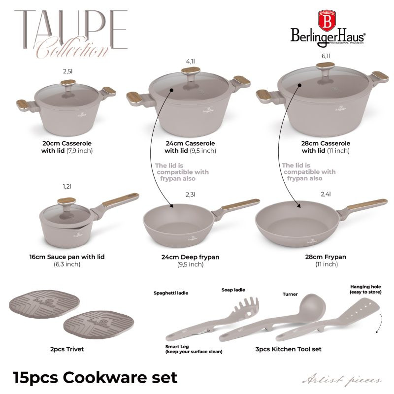 Súprava riadu s titánovým povrchom 15 ks Sahara Nordic Collection BERLINGERHAUS BH-8325 Objavte dokonalé spojenie elegantného dizajnu, modernej funkčnosti a neprekonateľnej kvality. Táto sada v jemnom matnom šedohnedom prevedení s detailmi vo vzhľade svetlého dreva je skutočnou ozdobou každej kuchyne. Varenie s ňou nie je len povinnosť - je to zážitok, ktorý si zamilujete. Materiál: • Kovaný hliník s nepriľnavým povrchom TitanPro (3× odolnejší ako bežné povrchy) Obsah sady (15 ks): • Hlboká panvica o 24×6,5 cm / 2,3 l • Panvica o 28×5,2 cm / 2,4 l • Kastról s pokrievkou (cedník) o 20×11 cm / 2,6 l • Kastról s pokrievkou (cedník) o 24×12,5 cm / 4,3 l • Kastról s pokrievkou (cedník) o 28×13 cm / 6,3 l • Hrniec s pokrievkou o 16×7,5 cm / 1,2 l • 3 ks kuchynského náčinia: obracačka s drážkami, naberačka na špagety, naberačka na polievku • 2 ks silikónových podložiek v šedohnedej farbe Kľúčové vlastnosti: • TitanPro povrch: 3x odolnejší, zaisťuje varenie bez pripaľovania as minimom tuku • Design & Ergonómia: Rukoväte a gombíky s mäkkým dotykom, striebornou vložkou a farbou svetlého dreva – nielen krásne, ale aj pohodlné a chladné na dotyk • Veká z tvrdeného skla: s otvorom na únik pary a silikónovým tesnením na tiché zatváranie • Indukčné turbo dno: rýchly ohrev, rovnomerná distribúcia tepla, úspora energie • Univerzálna kompatibilita: vhodné na všetky typy varných dosiek (vrátane indukcie) • Jednoduchá údržba: vďaka nepriľnavému povrchu aj elegantnému spracovaniu • Ekologická voľba: Bez PFOA, olova a kadmia Štýlová, praktická a spoľahlivá sada, ktorá z vašej kuchyne vytvorí miesto, kde budete variť s radosťou a servírovať s hrdosťou.