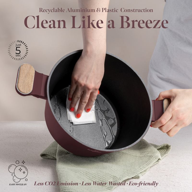 Súprava panvíc s titánovým povrchom 3 ks Sahara Marble Collection BERLINGERHAUS BH-8399 Vstúpte do sveta luxusu a precíznosti s touto exkluzívnou sadou panvíc Sahara Marble Collection. Matná bordová s elegantným mramorovým dizajnom dodá vašej kuchyni štýl a dotyk noblesy, zatiaľ čo TitanPro povrch zaistí dokonalý výkon pri každom varení. Materiál: kovaný hliník s nepriľnavým povrchom TitanPro Farba: matná bordová, drevená Obsah sady: • Panvica o 20 × 4,5 cm 1,0 l • Panvica o 24 × 4,8 cm 1,7 l • Grilovacia panvica o 28 × 4,1 cm 2,1 l Prečo si ju zamilujete: • 3× odolný nepriľnavý povrch TitanPro pre zdravé a ľahké varenie bez pripálenia • Ergonomická rukoväť s mäkkým povrchom, striebornou vložkou a mramorovou farbou, ktorá zostáva príjemne chladná • Elegantný minimalistický dizajn s matným povrchom, ktorý sa skvele hodí do modernej kuchyne • Výkonný indukčný turbo systém pre rýchly a úsporný ohrev • Vhodné na všetky typy varných dosiek • Ekologicky šetrné — bez PFOA, olova a kadmia • Jednoduchá údržba a čistenie Urobte z každého jedla majstrovské dielo a užite si varenie naplno s touto nádhernou sadou panvíc Sahara Marble Collection.