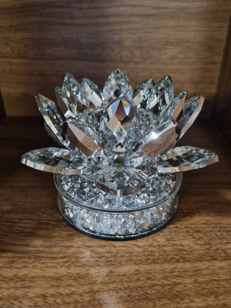 Svietnik CRISTAL - LOTUS Kombinácia skla a zrkadlového odrazu dodáva úžasný efekt luxusu a elegancie. Jeho nádherný odtieň a lesklý povrch vytvárajú jedinečnú žiaru, ktorá dodá miestnosti útulnosť a očarujúcu atmosféru.