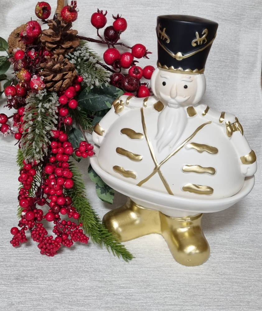 Vaše obľúbené druhy vianočného pečiva si zaslúžia mať svoju vlastnú dózu, v ktorej budú oddychovať, kým nepríde ich čas. Roztomilý motív Luskáčika, z ktorého vyžaruje jedinečné čaro Vianoc a tiež vyčarí úsmev na tvári. Krémový, zlato zdobený stojaci Luskáčik. Luskáčik je veľmi obľúbená vianočná figúrka, ktorá sa hodí do rustikálnych, ale aj moderných priestorov ako aj samotná dekorácia. Tiež je vhodný ako darček