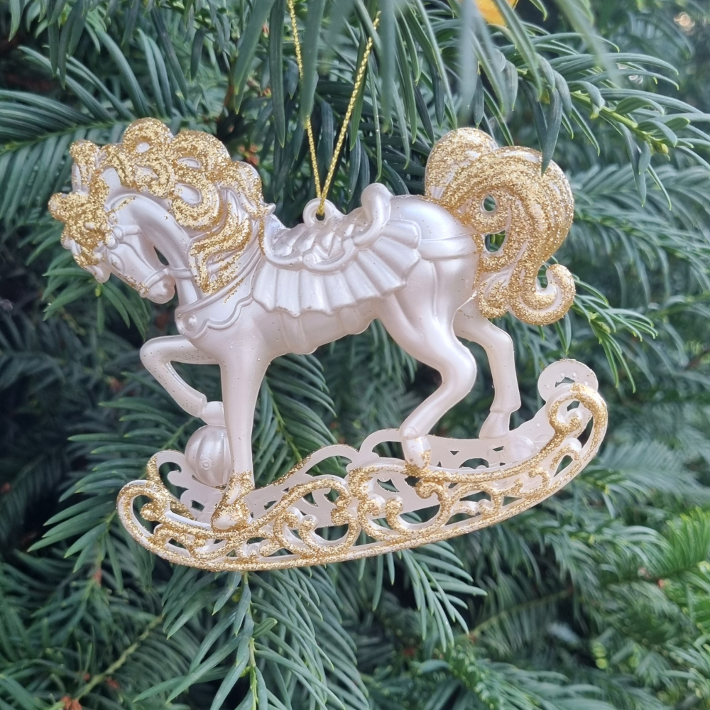 Detailne spracovaná ozdoba húpacieho koníka je veľmi pekným doplnkom na váš vianočný stromček či veniec.Dodajte vášmu vianočnému stromčeku luxus a eleganciu sú dokonalou voľbou, ak chcete vytvoriť luxusnú a štýlovú atmosféru vo vašom domove počas sviatkov.