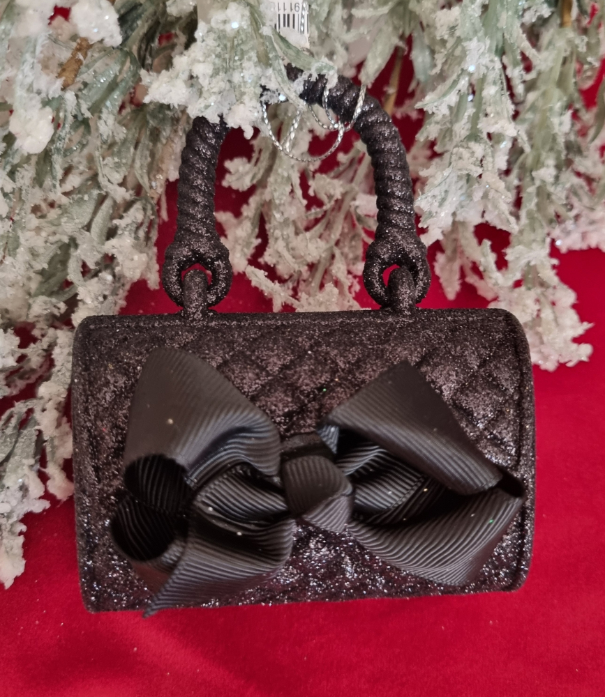 Krásne originálne ozdoby na vianočný stromček VINTAGE kabelky v čiernej farbe s trblietkami bude krásne odrážať svetlo vianočných svetielok.