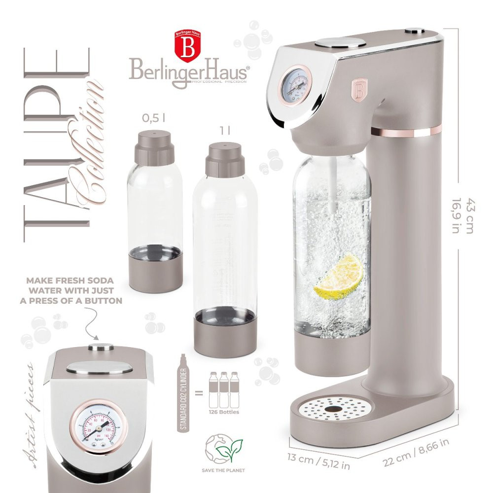 Výrobník sódy Sodabar je dizajnovo dokonalý domáci prístroj na výrobu perlivých nápojov. Tento kompaktný a štýlový prístroj je vyrobený z nerezovej ocele a polypropylénu a je navrhnutý tak, aby sa hodil do každej kuchyne. S rozmermi 43,5 cm x 22 cm x 12 cm sa zmestí na akúkoľvek kuchynskú linku. Výrobník sódy Sodabar prichádza s dvoma fľašami s objemom 1,0 L a 0,5 L. Prístroj je kompatibilný so štandardnými skrutkovacími CO2 bombičkami akejkoľvek značky (nie sú súčasťou balenia). Vďaka vstavanému barometru môžete ľahko nastaviť úroveň perlivosti od veľmi jemnej až po silne perlivú sódu. A to všetko stlačením jediného tlačidla! Výrobník sódy Sodabar je ekologické riešenie, ktoré pomáha znižovať produkciu plastového odpadu. Navyše nepotrebuje elektrinu ani batérie, takže je ideálny na použitie úplne kdekoľvek. Vlastnosti - Materiál: nerezová oceľ, PP - Veľkosť: 43,5 x 22 x 12 cm - 2 kusy vymeniteľnej fľaše s viečkom: 1,0 la 0,5 l - Univerzálna, štandardná veľkosť bombičiek CO2 (nie sú súčasťou dodávky) - Barometer - úrovne od super jemnej po silnú perlivú limonádu - Čerstvá sódová voda jednoduchým stlačením tlačidla - Nie je nutná elektrina ani batéria - Tlačidlo pre prívod vzduchu - Dvojité bezpečnostné uvoľnenie tlaku udržuje proces bezpečný a čistý - Ekologické riešenie - pomáha znižovať množstvo plastového odpadu - Farba: matná taupe - ružové zlato - TAUPE Collection - značka: Berlinger Haus